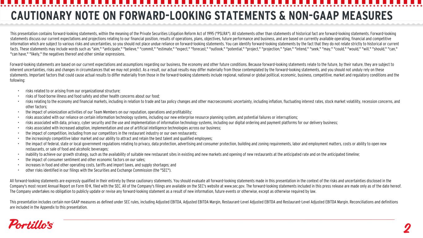 CAUTIONARY NOTE ON FORWARD-LOOKING STATEMENTS & NON-GAAP MEASURES This presentation contains forward-looking statements, within the meaning of the Private Securities Litigation Reform Act of 1995 ("PSLRA"). All statements other than statements of historical fact are forward-looking statements. Forward-looking statements discuss our current expectations and projections relating to our financial position, results of operations, plans, objectives, future performance and business, and are based on currently available operating, financial and competitive information which are subject to various risks and uncertainties, so you should not place undue reliance on forward-looking statements. You can identify forward-looking statements by the fact that they do not relate strictly to historical or current facts. These statements may include words such as "aim," "anticipate," "believe," "commit," "estimate," "expect," "forecast," "outlook," "potential," "project," "projection," "plan," "intend," "seek," "may," "could," "would," "will," "should," "can," "can have," "likely," the negatives thereof and other similar expressions. Forward-looking statements are based on our current expectations and assumptions regarding our business, the economy and other future conditions. Because forward-looking statements relate to the future, by their nature, they are subject to inherent uncertainties, risks and changes in circumstances that we may not predict. As a result, our actual results may differ materially from those contemplated by the forward-looking statements, and you should not unduly rely on these statements. Important factors that could cause actual results to differ materially from those in the forward-looking statements include regional, national or global political, economic, business, competitive, market and regulatory conditions and the following: • risks related to or arising from our organizational structure; • risks of food-borne illness and food safety and other health concerns about our food; • risks relating to the economy and financial markets, including in relation to trade and tax policy changes and other macroeconomic uncertainty, including inflation, fluctuating interest rates, stock market volatility, recession concerns, and other factors; • the impact of unionization activities of our Team Members on our reputation, operations and profitability; • risks associated with our reliance on certain information technology systems, including our new enterprise resource planning system, and potential failures or interruptions; • risks associated with data, privacy, cyber security and the use and implementation of information technology systems, including our digital ordering and payment platforms for our delivery business; • risks associated with increased adoption, implementation and use of artificial intelligence technologies across our business; • the impact of competition, including from our competitors in the restaurant industry or our own restaurants; • the increasingly competitive labor market and our ability to attract and retain the best talent and qualified employees; • the impact of federal, state or local government regulations relating to privacy, data protection, advertising and consumer protection, building and zoning requirements, labor and employment matters, costs or ability to open new restaurants, or sale of food and alcoholic beverages; • inability to achieve our growth strategy, such as the availability of suitable new restaurant sites in existing and new markets and opening of new restaurants at the anticipated rate and on the anticipated timeline; • the impact of consumer sentiment and other economic factors on our sales; • increases in food and other operating costs, tariffs and import taxes, and supply shortages; and • other risks identified in our filings with the Securities and Exchange Commission (the "SEC"). All forward-looking statements are expressly qualified in their entirety by these cautionary statements. You should evaluate all forward-looking statements made in this presentation in the context of the risks and uncertainties disclosed in the Company's most recent Annual Report on Form 10-K, filed with the SEC. All of the Company's filings are available on the SEC's website at www.sec.gov. The forward-looking statements included in this press release are made only as of the date hereof. The Company undertakes no obligation to publicly update or revise any forward-looking statement as a result of new information, future events or otherwise, except as otherwise required by law. This presentation includes certain non-GAAP measures as defined under SEC rules, including Adjusted EBITDA, Adjusted EBITDA Margin, Restaurant-Level Adjusted EBITDA and Restaurant-Level Adjusted EBITDA Margin. Reconciliations and definitions are included in the Appendix to this presentation.