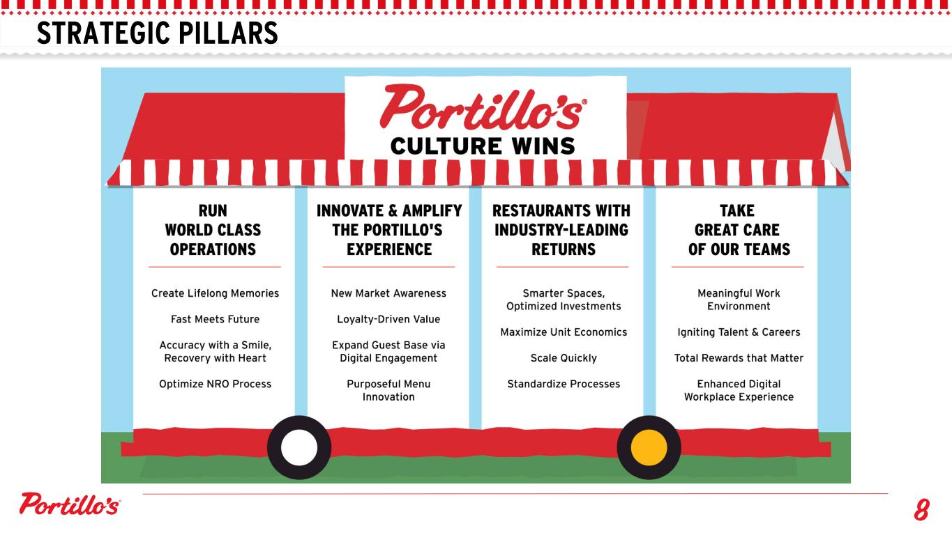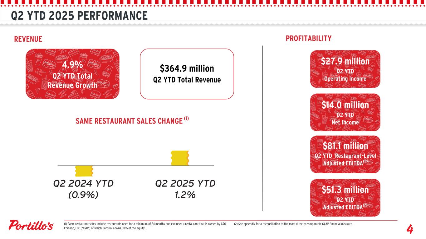 Q2 YTD 2025 PERFORMANCE REVENUE $364.9 million Q2 YTD Total Revenue SAME RESTAURANT SALES CHANGE (1) PROFITABILITY $27.9 million Q2 YTD Operating Income 4.9% Q2 YTD Total Revenue Growth (2) See appendix for a reconciliation to the most directly comparable GAAP financial measure. $51.3 million Q2 YTD Adjusted EBITDA(2) $81.1 million Q2 YTD Restaurant-Level Adjusted EBITDA(2) $14.0 million Q2 YTD Net Income (1) Same restaurant sales include restaurants open for a minimum of 24 months and excludes a restaurant that is owned by C&O Chicago, LLC ("C&O") of which Portillo's owns 50% of the equity.