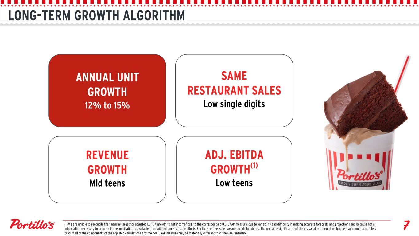 LONG-TERM GROWTH ALGORITHM ANNUAL UNIT GROWTH 12% to 15% SAME RESTAURANT SALES Low single digits REVENUE GROWTH Mid teens ADJ. EBITDA GROWTH(1) Low teens (1) We are unable to reconcile the financial target for adjusted EBITDA growth to net income/loss, to the corresponding U.S. GAAP measure, due to variability and difficulty in making accurate forecasts and projections and because not all information necessary to prepare the reconciliation is available to us without unreasonable efforts. For the same reasons, we are unable to address the probable significance of the unavailable information because we cannot accurately predict all of the components of the adjusted calculations and the non-GAAP measure may be materially different than the GAAP measure.