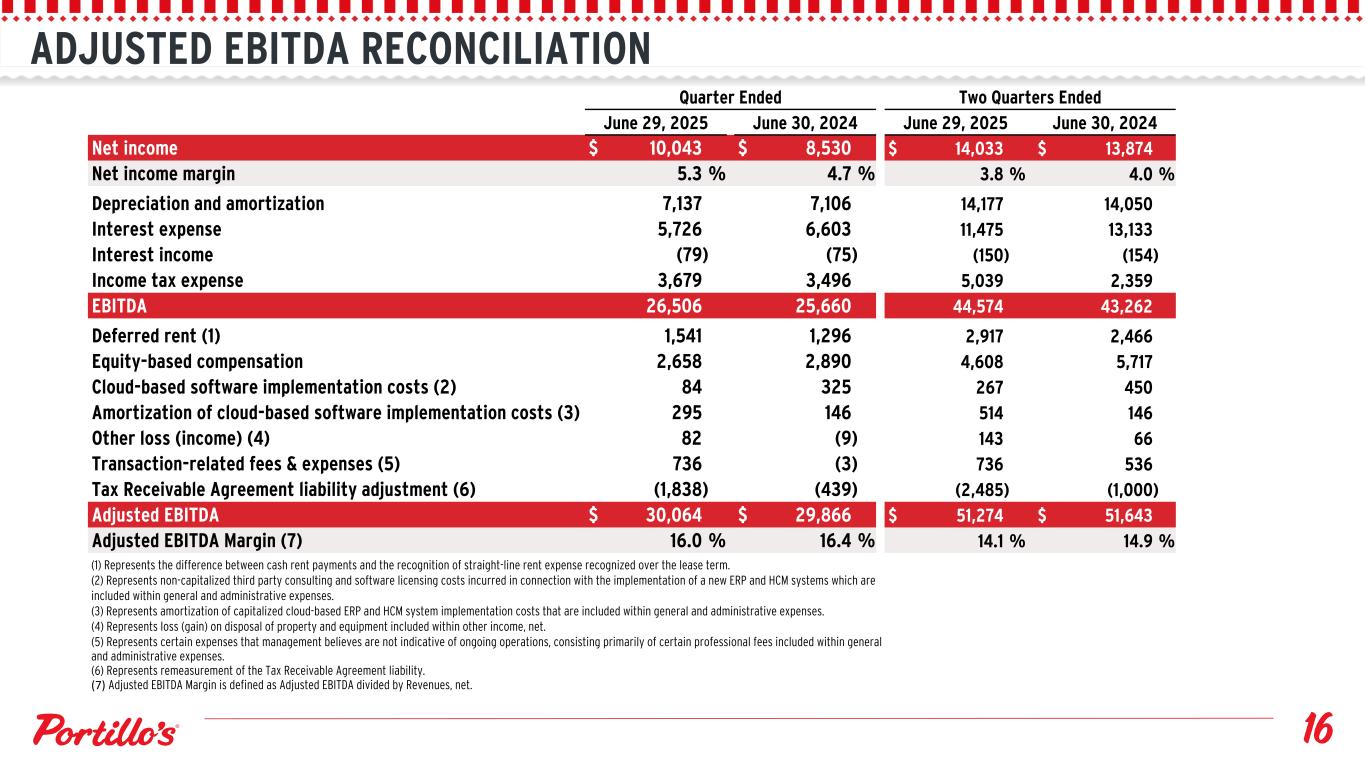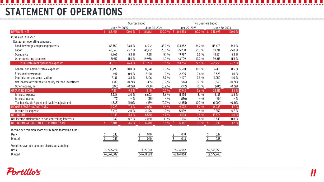 STATEMENT OF OPERATIONS Quarter Ended Two Quarters Ended June 29, 2025 June 30, 2024 June 29, 2025 June 30, 2024 REVENUES, NET $ 188,456 100.0 % $ 181,862 100.0 % $ 364,893 100.0 % $ 347,693 100.0 % COST AND EXPENSES: Restaurant operating expenses: Food, beverage and packaging costs 63,750 33.8 % 61,712 33.9 % 124,852 34.2 % 118,673 34.1 % Labor 48,340 25.7 % 46,412 25.5 % 95,208 26.1 % 89,714 25.8 % Occupancy 9,966 5.3 % 9,211 5.1 % 19,987 5.5 % 18,551 5.3 % Other operating expenses 21,919 11.6 % 19,958 11.0 % 43,709 12.0 % 39,815 11.5 % Total restaurant operating expenses 143,975 76.4 % 137,293 75.5 % 283,756 77.8 % 266,753 76.7 % General and administrative expenses 18,798 10.0 % 17,941 9.9 % 37,701 10.3 % 36,481 10.5 % Pre-opening expenses 1,697 0.9 % 2,100 1.2 % 2,205 0.6 % 3,523 1.0 % Depreciation and amortization 7,137 3.8 % 7,106 3.9 % 14,177 3.9 % 14,050 4.0 % Net income attributable to equity method investment (382) (0.2) % (335) (0.2) % (546) (0.1) % (540) (0.2) % Other income, net (300) (0.2) % (358) (0.2) % (312) (0.1) % (786) (0.2) % OPERATING INCOME 17,531 9.3 % 18,115 10.0 % 27,912 7.6 % 28,212 8.1 % Interest expense 5,726 3.0 % 6,603 3.6 % 11,475 3.1 % 13,133 3.8 % Interest income (79) — % (75) — % (150) — % (154) — % Tax Receivable Agreement liability adjustment (1,838) (1.0) % (439) (0.2) % (2,485) (0.7) % (1,000) (0.3) % INCOME BEFORE INCOME TAXES 13,722 7.3 % 12,026 6.6 % 19,072 5.2 % 16,233 4.7 % Income tax expense 3,679 2.0 % 3,496 1.9 % 5,039 1.4 % 2,359 0.7 % NET INCOME 10,043 5.3 % 8,530 4.7 % 14,033 3.8 % 13,874 4.0 % Net income attributable to non-controlling interests 1,339 0.7 % 2,060 1.1 % 2,016 0.6 % 2,842 0.8 % NET INCOME ATTRIBUTABLE TO PORTILLO'S INC. $ 8,704 4.6 % $ 6,470 3.6 % $ 12,017 3.3 % $ 11,032 3.2 % Income per common share attributable to Portillo’s Inc.: Basic $ 0.13 $ 0.10 $ 0.18 $ 0.19 Diluted $ 0.12 $ 0.10 $ 0.18 $ 0.18 Weighted-average common shares outstanding: Basic 67,595,224 61,650,118 65,716,582 59,543,950 Diluted 69,867,802 64,608,698 68,174,864 62,577,748