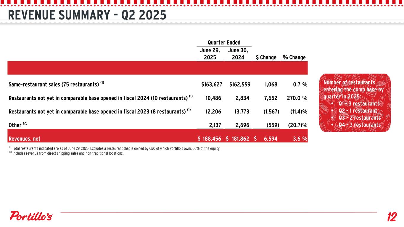 REVENUE SUMMARY - Q2 2025 Quarter Ended June 29, 2025 June 30, 2024 $ Change % Change Same-restaurant sales (75 restaurants) (1) $163,627 $162,559 1,068 0.7 % Restaurants not yet in comparable base opened in fiscal 2024 (10 restaurants) (1) 10,486 2,834 7,652 270.0 % Restaurants not yet in comparable base opened in fiscal 2023 (8 restaurants) (1) 12,206 13,773 (1,567) (11.4) % Other (2) 2,137 2,696 (559) (20.7) % Revenues, net $ 188,456 $ 181,862 $ 6,594 3.6 % (1) Total restaurants indicated are as of June 29, 2025. Excludes a restaurant that is owned by C&O of which Portillo’s owns 50% of the equity. (2) Includes revenue from direct shipping sales and non-traditional locations. TAKEAWAYS Number of restaurants entering the comp base by quarter in 2025: • Q1 - 3 restaurants • Q2 - 1 restaurant • Q3 - 2 restaurants • Q4 - 3 restaurants