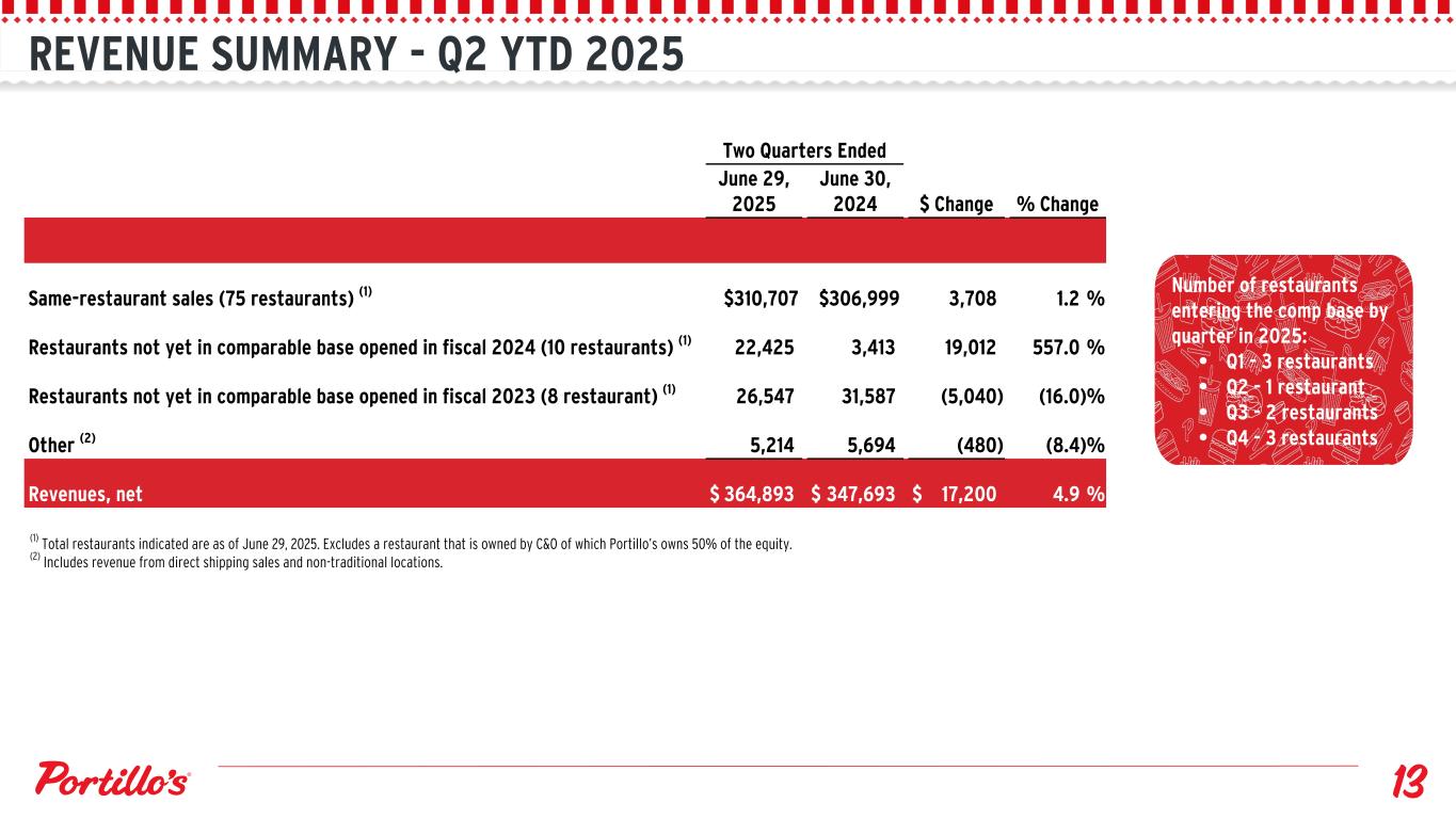 REVENUE SUMMARY - Q2 YTD 2025 Two Quarters Ended June 29, 2025 June 30, 2024 $ Change % Change Same-restaurant sales (75 restaurants) (1) $310,707 $306,999 3,708 1.2 % Restaurants not yet in comparable base opened in fiscal 2024 (10 restaurants) (1) 22,425 3,413 19,012 557.0 % Restaurants not yet in comparable base opened in fiscal 2023 (8 restaurant) (1) 26,547 31,587 (5,040) (16.0) % Other (2) 5,214 5,694 (480) (8.4) % Revenues, net $ 364,893 $ 347,693 $ 17,200 4.9 % (1) Total restaurants indicated are as of June 29, 2025. Excludes a restaurant that is owned by C&O of which Portillo’s owns 50% of the equity. (2) Includes revenue from direct shipping sales and non-traditional locations. Number of restaurants entering the comp base by quarter in 2025: • Q1 - 3 restaurants • Q2 - 1 restaurant • Q3 - 2 restaurants • Q4 - 3 restaurants