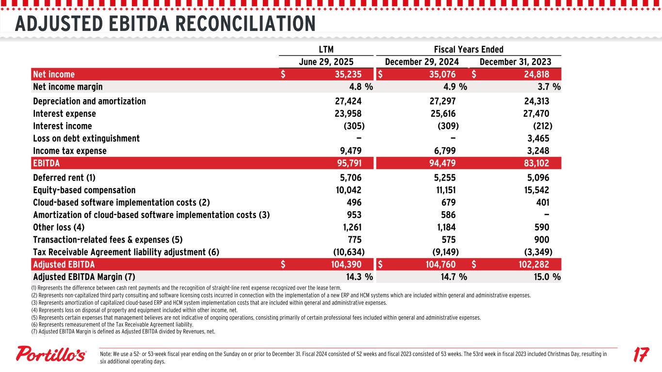 LTM Fiscal Years Ended June 29, 2025 December 29, 2024 December 31, 2023 Net income $ 35,235 $ 35,076 $ 24,818 Net income margin 4.8 % 4.9 % 3.7 % Depreciation and amortization 27,424 27,297 24,313 Interest expense 23,958 25,616 27,470 Interest income (305) (309) (212) Loss on debt extinguishment — — 3,465 Income tax expense 9,479 6,799 3,248 EBITDA 95,791 94,479 83,102 Deferred rent (1) 5,706 5,255 5,096 Equity-based compensation 10,042 11,151 15,542 Cloud-based software implementation costs (2) 496 679 401 Amortization of cloud-based software implementation costs (3) 953 586 — Other loss (4) 1,261 1,184 590 Transaction-related fees & expenses (5) 775 575 900 Tax Receivable Agreement liability adjustment (6) (10,634) (9,149) (3,349) Adjusted EBITDA $ 104,390 $ 104,760 $ 102,282 Adjusted EBITDA Margin (7) 14.3 % 14.7 % 15.0 % ADJUSTED EBITDA RECONCILIATION (1) Represents the difference between cash rent payments and the recognition of straight-line rent expense recognized over the lease term. (2) Represents non-capitalized third party consulting and software licensing costs incurred in connection with the implementation of a new ERP and HCM systems which are included within general and administrative expenses. (3) Represents amortization of capitalized cloud-based ERP and HCM system implementation costs that are included within general and administrative expenses. (4) Represents loss on disposal of property and equipment included within other income, net. (5) Represents certain expenses that management believes are not indicative of ongoing operations, consisting primarily of certain professional fees included within general and administrative expenses. (6) Represents remeasurement of the Tax Receivable Agreement liability. (7) Adjusted EBITDA Margin is defined as Adjusted EBITDA divided by Revenues, net. Note: We use a 52- or 53-week fiscal year ending on the Sunday on or prior to December 31. Fiscal 2024 consisted of 52 weeks and fiscal 2023 consisted of 53 weeks. The 53rd week in fiscal 2023 included Christmas Day, resulting in six additional operating days.