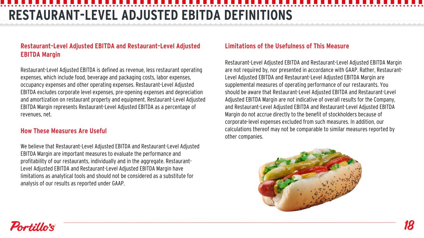 RESTAURANT-LEVEL ADJUSTED EBITDA DEFINITIONS Restaurant-Level Adjusted EBITDA and Restaurant-Level Adjusted EBITDA Margin Restaurant-Level Adjusted EBITDA is defined as revenue, less restaurant operating expenses, which include food, beverage and packaging costs, labor expenses, occupancy expenses and other operating expenses. Restaurant-Level Adjusted EBITDA excludes corporate level expenses, pre-opening expenses and depreciation and amortization on restaurant property and equipment. Restaurant-Level Adjusted EBITDA Margin represents Restaurant-Level Adjusted EBITDA as a percentage of revenues, net. How These Measures Are Useful We believe that Restaurant-Level Adjusted EBITDA and Restaurant-Level Adjusted EBITDA Margin are important measures to evaluate the performance and profitability of our restaurants, individually and in the aggregate. Restaurant- Level Adjusted EBITDA and Restaurant-Level Adjusted EBITDA Margin have limitations as analytical tools and should not be considered as a substitute for analysis of our results as reported under GAAP. Limitations of the Usefulness of This Measure Restaurant-Level Adjusted EBITDA and Restaurant-Level Adjusted EBITDA Margin are not required by, nor presented in accordance with GAAP. Rather, Restaurant- Level Adjusted EBITDA and Restaurant-Level Adjusted EBITDA Margin are supplemental measures of operating performance of our restaurants. You should be aware that Restaurant-Level Adjusted EBITDA and Restaurant-Level Adjusted EBITDA Margin are not indicative of overall results for the Company, and Restaurant-Level Adjusted EBITDA and Restaurant-Level Adjusted EBITDA Margin do not accrue directly to the benefit of stockholders because of corporate-level expenses excluded from such measures. In addition, our calculations thereof may not be comparable to similar measures reported by other companies.