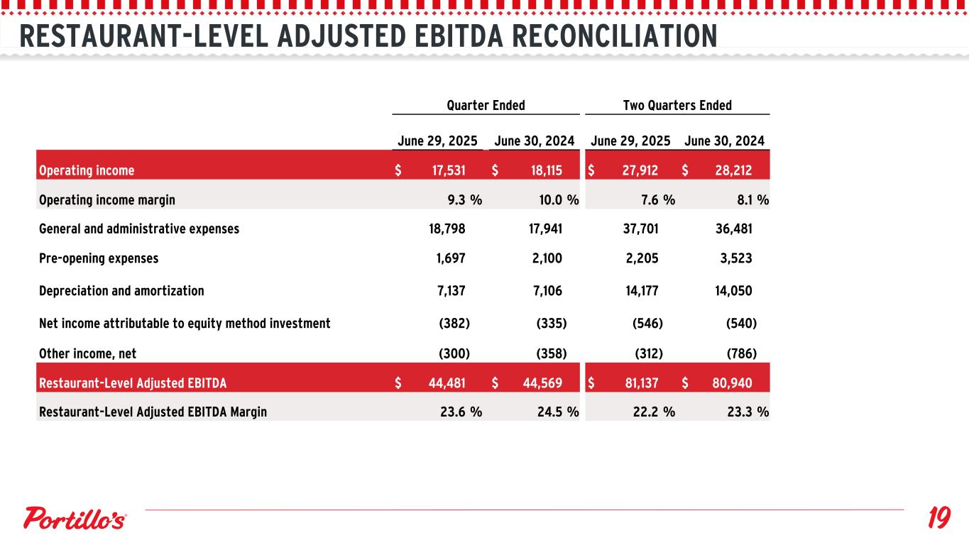 RESTAURANT-LEVEL ADJUSTED EBITDA RECONCILIATION Quarter Ended Two Quarters Ended June 29, 2025 June 30, 2024 June 29, 2025 June 30, 2024 Operating income $ 17,531 $ 18,115 $ 27,912 $ 28,212 Operating income margin 9.3 % 10.0 % 7.6 % 8.1 % General and administrative expenses 18,798 17,941 37,701 36,481 Pre-opening expenses 1,697 2,100 2,205 3,523 Depreciation and amortization 7,137 7,106 14,177 14,050 Net income attributable to equity method investment (382) (335) (546) (540) Other income, net (300) (358) (312) (786) Restaurant-Level Adjusted EBITDA $ 44,481 $ 44,569 $ 81,137 $ 80,940 Restaurant-Level Adjusted EBITDA Margin 23.6 % 24.5 % 22.2 % 23.3 %