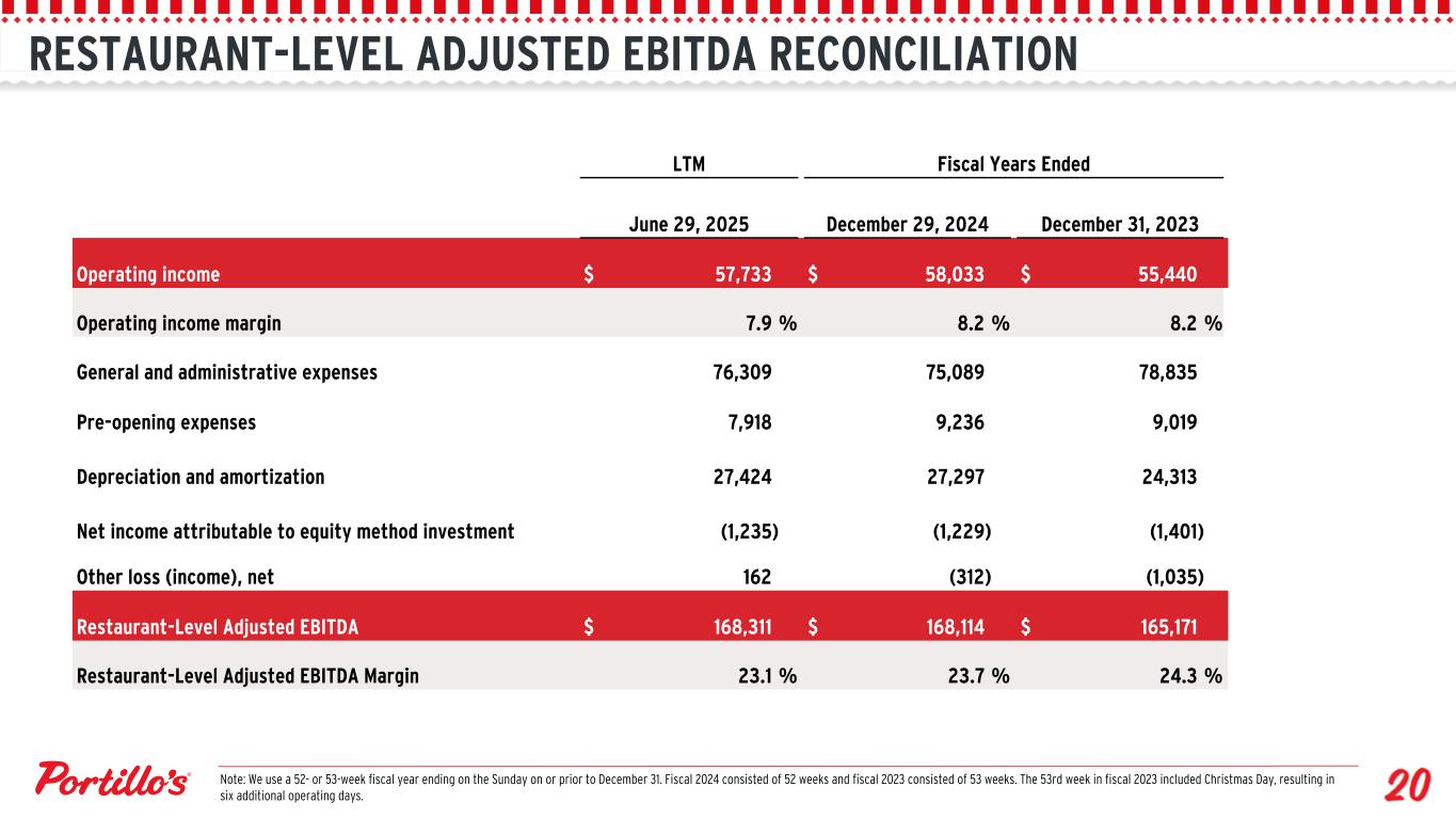 RESTAURANT-LEVEL ADJUSTED EBITDA RECONCILIATION LTM Fiscal Years Ended June 29, 2025 December 29, 2024 December 31, 2023 Operating income $ 57,733 $ 58,033 $ 55,440 Operating income margin 7.9 % 8.2 % 8.2 % General and administrative expenses 76,309 75,089 78,835 Pre-opening expenses 7,918 9,236 9,019 Depreciation and amortization 27,424 27,297 24,313 Net income attributable to equity method investment (1,235) (1,229) (1,401) Other loss (income), net 162 (312) (1,035) Restaurant-Level Adjusted EBITDA $ 168,311 $ 168,114 $ 165,171 Restaurant-Level Adjusted EBITDA Margin 23.1 % 23.7 % 24.3 % Note: We use a 52- or 53-week fiscal year ending on the Sunday on or prior to December 31. Fiscal 2024 consisted of 52 weeks and fiscal 2023 consisted of 53 weeks. The 53rd week in fiscal 2023 included Christmas Day, resulting in six additional operating days.