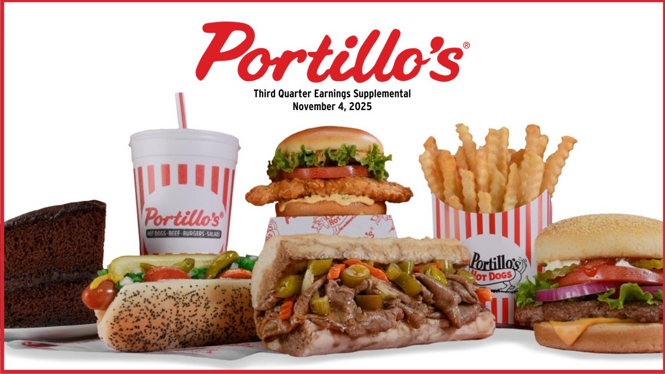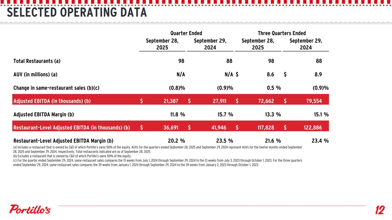 SELECTED OPERATING DATA (a) Includes a restaurant that is owned by C&O of which Portillo’s owns 50% of the equity. AUVs for the quarters ended September 28, 2025 and September 29, 2024 represent AUVs for the twelve months ended September 28, 2025 and September 29, 2024, respectively. Total restaurants indicated are as of September 28, 2025. (b) Excludes a restaurant that is owned by C&O of which Portillo’s owns 50% of the equity. (c) For the quarter ended September 29, 2024, same-restaurant sales compares the 13 weeks from July 1, 2024 through September 29, 2024 to the 13 weeks from July 3, 2023 through October 1, 2023. For the three quarters ended September 29, 2024, same-restaurant sales compares the 39 weeks from January 1, 2024 through September 29, 2024 to the 39 weeks from January 2, 2023 through October 1, 2023 Quarter Ended Three Quarters Ended September 28, 2025 September 29, 2024 September 28, 2025 September 29, 2024 Total Restaurants (a) 98 88 98 88 AUV (in millions) (a) N/A N/A $ 8.6 $ 8.9 Change in same-restaurant sales (b)(c) (0.8) % (0.9) % 0.5 % (0.9) % Adjusted EBITDA (in thousands) (b) $ 21,387 $ 27,911 $ 72,662 $ 79,554 Adjusted EBITDA Margin (b) 11.8 % 15.7 % 13.3 % 15.1 % Restaurant-Level Adjusted EBITDA (in thousands) (b) $ 36,691 $ 41,946 $ 117,828 $ 122,886 Restaurant-Level Adjusted EBITDA Margin (b) 20.2 % 23.5 % 21.6 % 23.4 %
