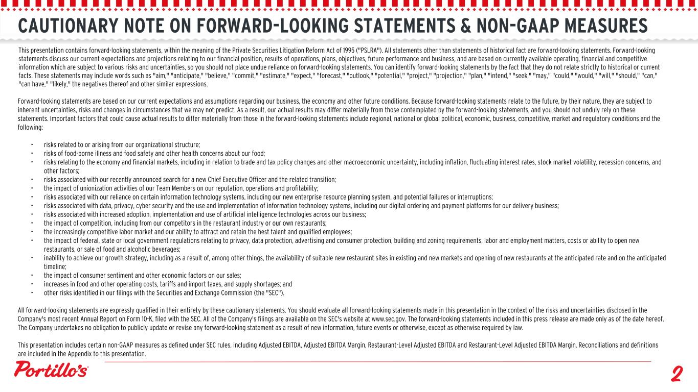 CAUTIONARY NOTE ON FORWARD-LOOKING STATEMENTS & NON-GAAP MEASURES This presentation contains forward-looking statements, within the meaning of the Private Securities Litigation Reform Act of 1995 ("PSLRA"). All statements other than statements of historical fact are forward-looking statements. Forward-looking statements discuss our current expectations and projections relating to our financial position, results of operations, plans, objectives, future performance and business, and are based on currently available operating, financial and competitive information which are subject to various risks and uncertainties, so you should not place undue reliance on forward-looking statements. You can identify forward-looking statements by the fact that they do not relate strictly to historical or current facts. These statements may include words such as "aim," "anticipate," "believe," "commit," "estimate," "expect," "forecast," "outlook," "potential," "project," "projection," "plan," "intend," "seek," "may," "could," "would," "will," "should," "can," "can have," "likely," the negatives thereof and other similar expressions. Forward-looking statements are based on our current expectations and assumptions regarding our business, the economy and other future conditions. Because forward-looking statements relate to the future, by their nature, they are subject to inherent uncertainties, risks and changes in circumstances that we may not predict. As a result, our actual results may differ materially from those contemplated by the forward-looking statements, and you should not unduly rely on these statements. Important factors that could cause actual results to differ materially from those in the forward-looking statements include regional, national or global political, economic, business, competitive, market and regulatory conditions and the following: • risks related to or arising from our organizational structure; • risks of food-borne illness and food safety and other health concerns about our food; • risks relating to the economy and financial markets, including in relation to trade and tax policy changes and other macroeconomic uncertainty, including inflation, fluctuating interest rates, stock market volatility, recession concerns, and other factors; • risks associated with our recently announced search for a new Chief Executive Officer and the related transition; • the impact of unionization activities of our Team Members on our reputation, operations and profitability; • risks associated with our reliance on certain information technology systems, including our new enterprise resource planning system, and potential failures or interruptions; • risks associated with data, privacy, cyber security and the use and implementation of information technology systems, including our digital ordering and payment platforms for our delivery business; • risks associated with increased adoption, implementation and use of artificial intelligence technologies across our business; • the impact of competition, including from our competitors in the restaurant industry or our own restaurants; • the increasingly competitive labor market and our ability to attract and retain the best talent and qualified employees; • the impact of federal, state or local government regulations relating to privacy, data protection, advertising and consumer protection, building and zoning requirements, labor and employment matters, costs or ability to open new restaurants, or sale of food and alcoholic beverages; • inability to achieve our growth strategy, including as a result of, among other things, the availability of suitable new restaurant sites in existing and new markets and opening of new restaurants at the anticipated rate and on the anticipated timeline; • the impact of consumer sentiment and other economic factors on our sales; • increases in food and other operating costs, tariffs and import taxes, and supply shortages; and • other risks identified in our filings with the Securities and Exchange Commission (the "SEC"). All forward-looking statements are expressly qualified in their entirety by these cautionary statements. You should evaluate all forward-looking statements made in this presentation in the context of the risks and uncertainties disclosed in the Company's most recent Annual Report on Form 10-K, filed with the SEC. All of the Company's filings are available on the SEC's website at www.sec.gov. The forward-looking statements included in this press release are made only as of the date hereof. The Company undertakes no obligation to publicly update or revise any forward-looking statement as a result of new information, future events or otherwise, except as otherwise required by law. This presentation includes certain non-GAAP measures as defined under SEC rules, including Adjusted EBITDA, Adjusted EBITDA Margin, Restaurant-Level Adjusted EBITDA and Restaurant-Level Adjusted EBITDA Margin. Reconciliations and definitions are included in the Appendix to this presentation.