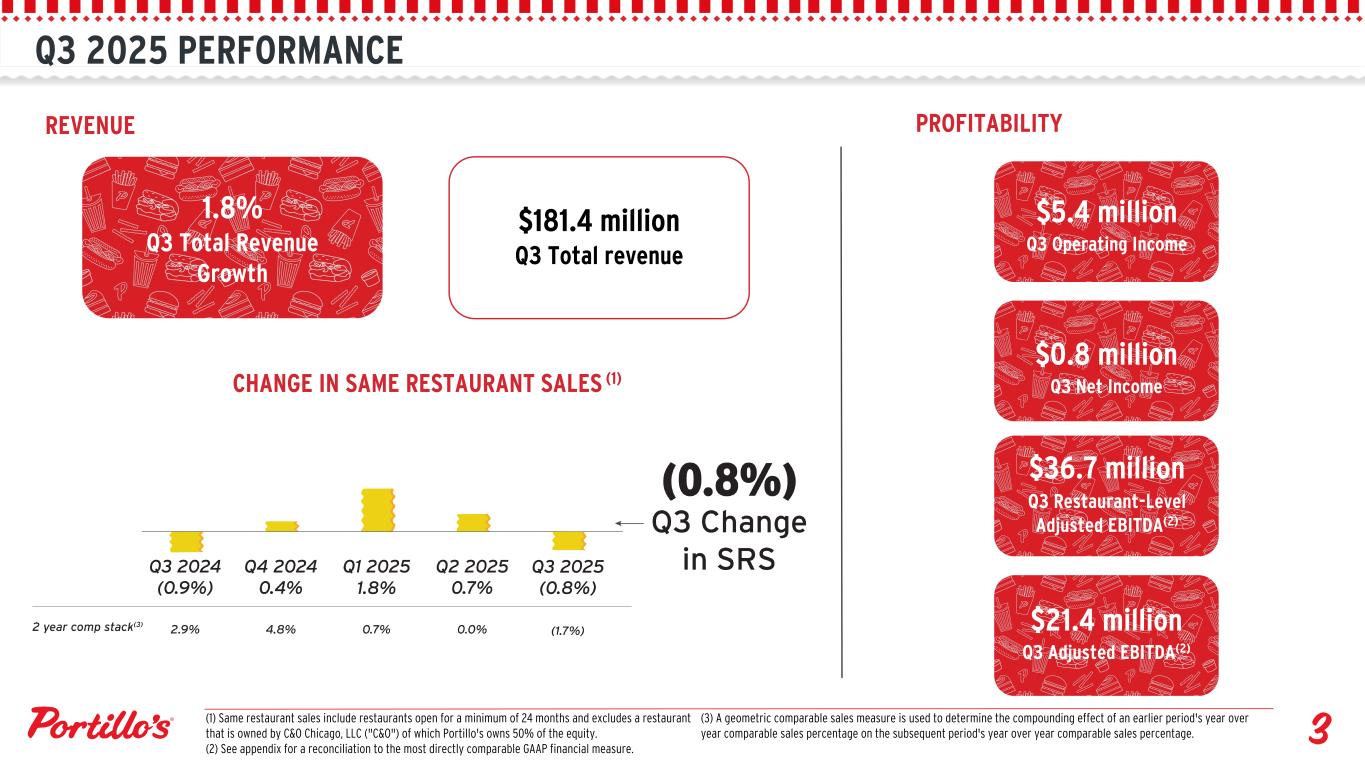 Q3 2025 PERFORMANCE REVENUE $181.4 million Q3 Total revenue CHANGE IN SAME RESTAURANT SALES (1) PROFITABILITY $5.4 million Q3 Operating Income 1.8% Q3 Total Revenue Growth (3) A geometric comparable sales measure is used to determine the compounding effect of an earlier period's year over year comparable sales percentage on the subsequent period's year over year comparable sales percentage. $21.4 million Q3 Adjusted EBITDA(2) $36.7 million Q3 Restaurant-Level Adjusted EBITDA(2) $0.8 million Q3 Net Income (1) Same restaurant sales include restaurants open for a minimum of 24 months and excludes a restaurant that is owned by C&O Chicago, LLC ("C&O") of which Portillo's owns 50% of the equity. (2) See appendix for a reconciliation to the most directly comparable GAAP financial measure.