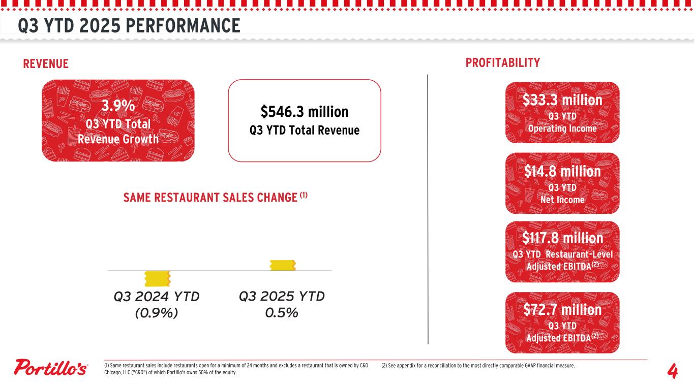 Q3 YTD 2025 PERFORMANCE REVENUE $546.3 million Q3 YTD Total Revenue SAME RESTAURANT SALES CHANGE (1) PROFITABILITY $33.3 million Q3 YTD Operating Income 3.9% Q3 YTD Total Revenue Growth (2) See appendix for a reconciliation to the most directly comparable GAAP financial measure. $72.7 million Q3 YTD Adjusted EBITDA(2) $117.8 million Q3 YTD Restaurant-Level Adjusted EBITDA(2) $14.8 million Q3 YTD Net Income (1) Same restaurant sales include restaurants open for a minimum of 24 months and excludes a restaurant that is owned by C&O Chicago, LLC ("C&O") of which Portillo's owns 50% of the equity.