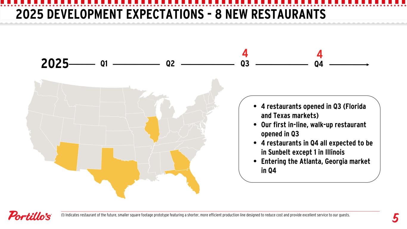 2025 DEVELOPMENT EXPECTATIONS - 8 NEW RESTAURANTS Q1 Q2 Q3 Q4 4 4 2025 • 4 restaurants opened in Q3 (Florida and Texas markets) • Our first in-line, walk-up restaurant opened in Q3 • 4 restaurants in Q4 all expected to be in Sunbelt except 1 in Illinois • Entering the Atlanta, Georgia market in Q4 (1) Indicates restaurant of the future, smaller square footage prototype featuring a shorter, more efficient production line designed to reduce cost and provide excellent service to our guests.