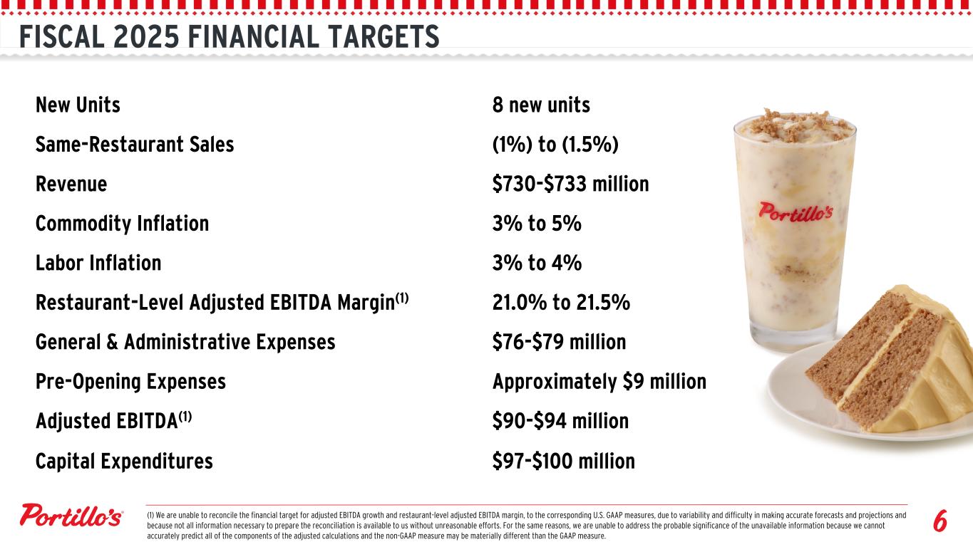 FISCAL 2025 FINANCIAL TARGETS (1) We are unable to reconcile the long-term outlook for Adjusted EBITDA growth to net income (loss), the corresponding U.S. GAAP measure, due to variability and difficulty in making accurate forecasts and projections and because not all information necessary to prepare the reconciliation is available to us without unreasonable efforts. For the same reasons, we are unable to address the probable significance of the unavailable information because we cannot accurately predict all of the components of the adjusted calculations and the non-GAAP measure may be materially different than the GAAP measure. New Units 8 new units Same-Restaurant Sales (1%) to (1.5%) Revenue $730-$733 million Commodity Inflation 3% to 5% Labor Inflation 3% to 4% Restaurant-Level Adjusted EBITDA Margin(1) 21.0% to 21.5% General & Administrative Expenses $76-$79 million Pre-Opening Expenses Approximately $9 million Adjusted EBITDA(1) $90-$94 million Capital Expenditures $97-$100 million (1) We are unable to reconcile the financial target for adjusted EBITDA growth and restaurant-level adjusted EBITDA margin, to the corresponding U.S. GAAP measures, due to variability and difficulty in making accurate forecasts and projections and because not all information necessary to prepare the reconciliation is available to us without unreasonable efforts. For the same reasons, we are unable to address the probable significance of the unavailable information because we cannot accurately predict all of the components of the adjusted calculations and the non-GAAP measure may be materially different than the GAAP measure. 1 1-2 2-3 6-7 Q1 2024 Q2 2024 Q3 2024 Q4 2024 New Restaurants by Quarter