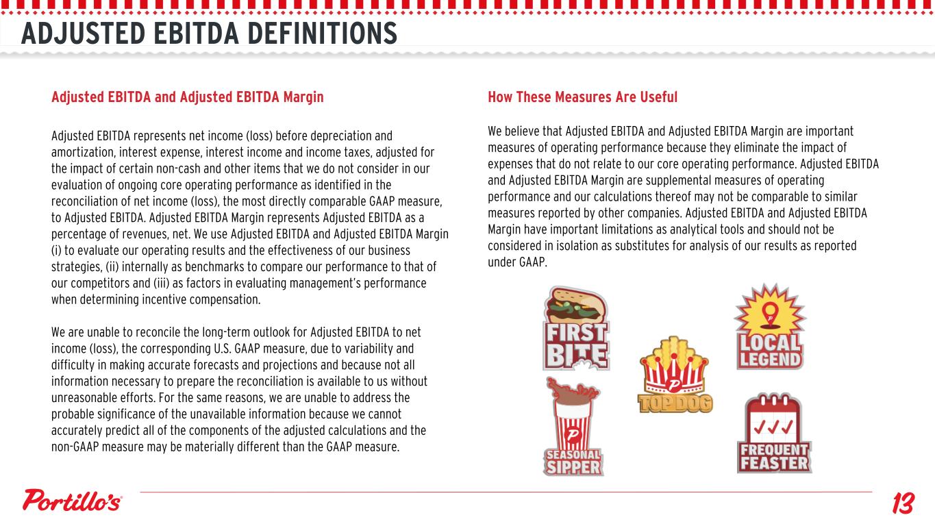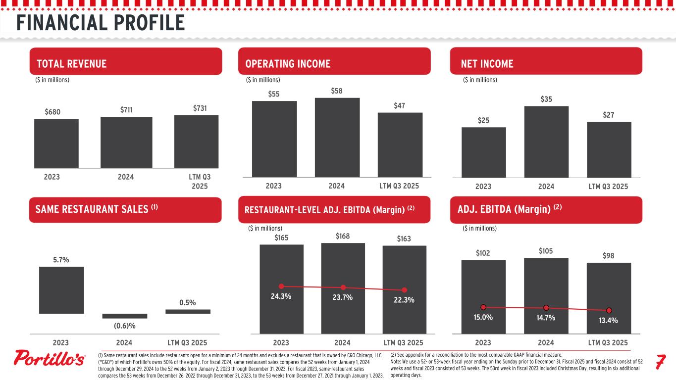 FINANCIAL PROFILE $55 $58 $47 2023 2024 LTM Q3 2025 $165 $168 $163 24.3% 23.7% 22.3% 2023 2024 LTM Q3 2025 $25 $35 $27 2023 2024 LTM Q3 2025 $102 $105 $98 15.0% 14.7% 13.4% 2023 2024 LTM Q3 2025 $680 $711 $731 2023 2024 LTM Q3 2025 5.7% (0.6)% 0.5% 2023 2024 LTM Q3 2025 TOTAL REVENUE OPERATING INCOME NET INCOME SAME RESTAURANT SALES (1) RESTAURANT-LEVEL ADJ. EBITDA (Margin) (2) ADJ. EBITDA (Margin) (2) ($ in millions) ($ in millions) ($ in millions) ($ in millions) ($ in millions) (1) Same restaurant sales include restaurants open for a minimum of 24 months and excludes a restaurant that is owned by C&O Chicago, LLC ("C&O") of which Portillo's owns 50% of the equity. For fiscal 2024, same-restaurant sales compares the 52 weeks from January 1, 2024 through December 29, 2024 to the 52 weeks from January 2, 2023 through December 31, 2023. For fiscal 2023, same-restaurant sales compares the 53 weeks from December 26, 2022 through December 31, 2023, to the 53 weeks from December 27, 2021 through January 1, 2023. (2) See appendix for a reconciliation to the most comparable GAAP financial measure. Note: We use a 52- or 53-week fiscal year ending on the Sunday prior to December 31. Fiscal 2025 and fiscal 2024 consist of 52 weeks and fiscal 2023 consisted of 53 weeks. The 53rd week in fiscal 2023 included Christmas Day, resulting in six additional operating days.