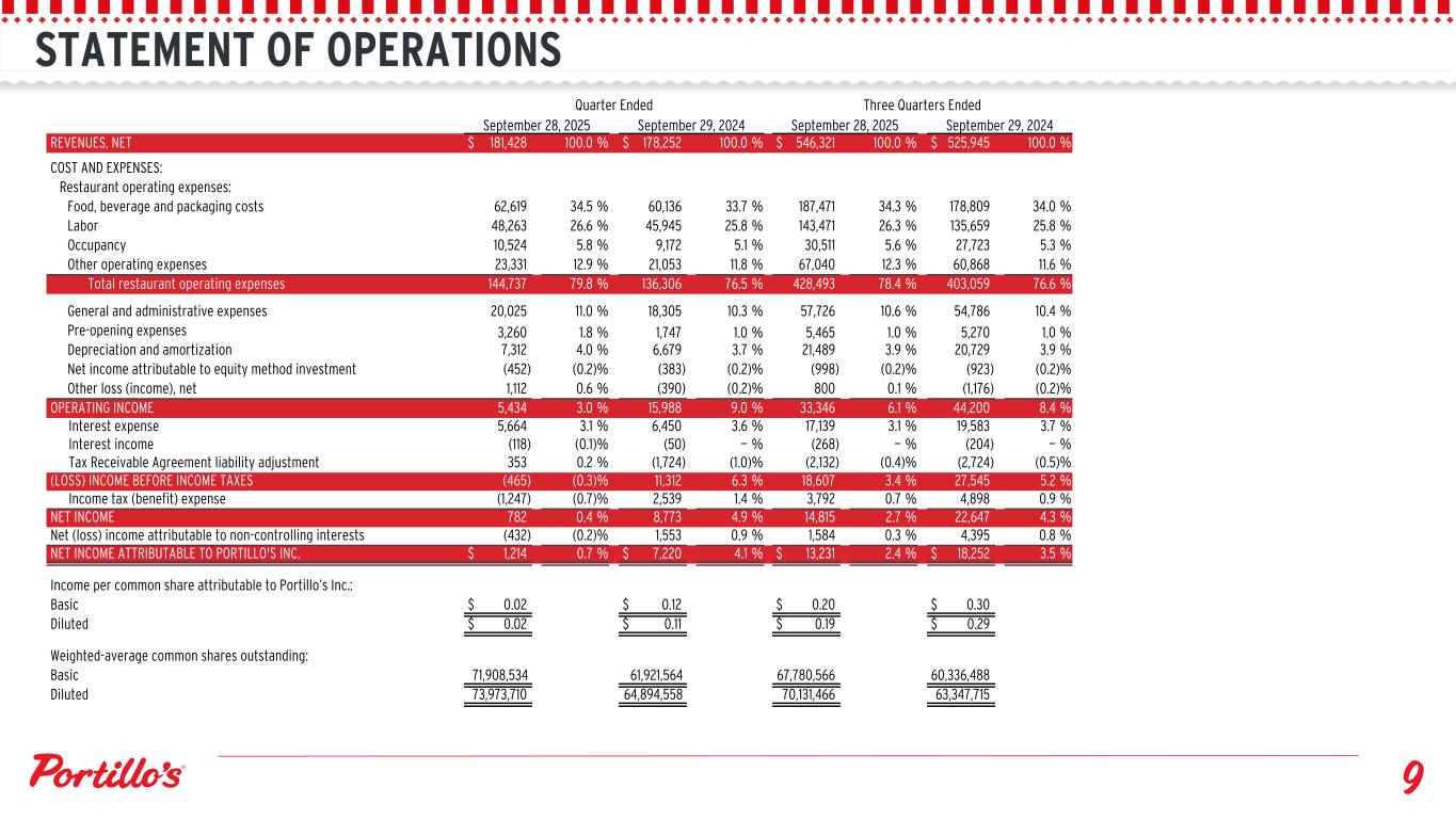 STATEMENT OF OPERATIONS Quarter Ended Three Quarters Ended September 28, 2025 September 29, 2024 September 28, 2025 September 29, 2024 REVENUES, NET $ 181,428 100.0 % $ 178,252 100.0 % $ 546,321 100.0 % $ 525,945 100.0 % COST AND EXPENSES: Restaurant operating expenses: Food, beverage and packaging costs 62,619 34.5 % 60,136 33.7 % 187,471 34.3 % 178,809 34.0 % Labor 48,263 26.6 % 45,945 25.8 % 143,471 26.3 % 135,659 25.8 % Occupancy 10,524 5.8 % 9,172 5.1 % 30,511 5.6 % 27,723 5.3 % Other operating expenses 23,331 12.9 % 21,053 11.8 % 67,040 12.3 % 60,868 11.6 % Total restaurant operating expenses 144,737 79.8 % 136,306 76.5 % 428,493 78.4 % 403,059 76.6 % General and administrative expenses 20,025 11.0 % 18,305 10.3 % 57,726 10.6 % 54,786 10.4 % Pre-opening expenses 3,260 1.8 % 1,747 1.0 % 5,465 1.0 % 5,270 1.0 % Depreciation and amortization 7,312 4.0 % 6,679 3.7 % 21,489 3.9 % 20,729 3.9 % Net income attributable to equity method investment (452) (0.2) % (383) (0.2) % (998) (0.2) % (923) (0.2) % Other loss (income), net 1,112 0.6 % (390) (0.2) % 800 0.1 % (1,176) (0.2) % OPERATING INCOME 5,434 3.0 % 15,988 9.0 % 33,346 6.1 % 44,200 8.4 % Interest expense 5,664 3.1 % 6,450 3.6 % 17,139 3.1 % 19,583 3.7 % Interest income (118) (0.1) % (50) — % (268) — % (204) — % Tax Receivable Agreement liability adjustment 353 0.2 % (1,724) (1.0) % (2,132) (0.4) % (2,724) (0.5) % (LOSS) INCOME BEFORE INCOME TAXES (465) (0.3) % 11,312 6.3 % 18,607 3.4 % 27,545 5.2 % Income tax (benefit) expense (1,247) (0.7) % 2,539 1.4 % 3,792 0.7 % 4,898 0.9 % NET INCOME 782 0.4 % 8,773 4.9 % 14,815 2.7 % 22,647 4.3 % Net (loss) income attributable to non-controlling interests (432) (0.2) % 1,553 0.9 % 1,584 0.3 % 4,395 0.8 % NET INCOME ATTRIBUTABLE TO PORTILLO'S INC. $ 1,214 0.7 % $ 7,220 4.1 % $ 13,231 2.4 % $ 18,252 3.5 % Income per common share attributable to Portillo’s Inc.: Basic $ 0.02 $ 0.12 $ 0.20 $ 0.30 Diluted $ 0.02 $ 0.11 $ 0.19 $ 0.29 Weighted-average common shares outstanding: Basic 71,908,534 61,921,564 67,780,566 60,336,488 Diluted 73,973,710 64,894,558 70,131,466 63,347,715