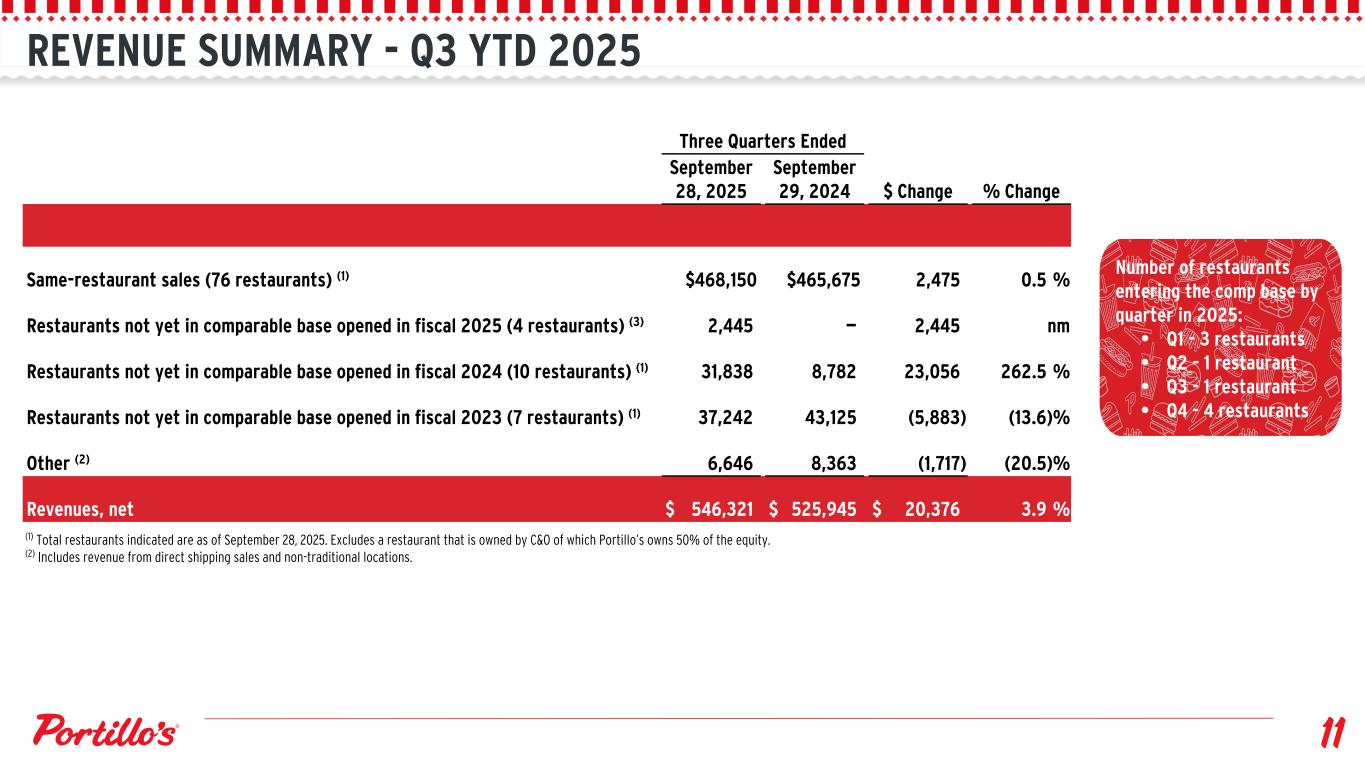 REVENUE SUMMARY - Q3 YTD 2025 Three Quarters Ended September 28, 2025 September 29, 2024 $ Change % Change Same-restaurant sales (76 restaurants) (1) $468,150 $465,675 2,475 0.5 % Restaurants not yet in comparable base opened in fiscal 2025 (4 restaurants) (3) 2,445 — 2,445 nm Restaurants not yet in comparable base opened in fiscal 2024 (10 restaurants) (1) 31,838 8,782 23,056 262.5 % Restaurants not yet in comparable base opened in fiscal 2023 (7 restaurants) (1) 37,242 43,125 (5,883) (13.6) % Other (2) 6,646 8,363 (1,717) (20.5) % Revenues, net $ 546,321 $ 525,945 $ 20,376 3.9 % (1) Total restaurants indicated are as of September 28, 2025. Excludes a restaurant that is owned by C&O of which Portillo’s owns 50% of the equity. (2) Includes revenue from direct shipping sales and non-traditional locations. Number of restaurants entering the comp base by quarter in 2025: • Q1 - 3 restaurants • Q2 - 1 restaurant • Q3 - 1 restaurant • Q4 - 4 restaurants