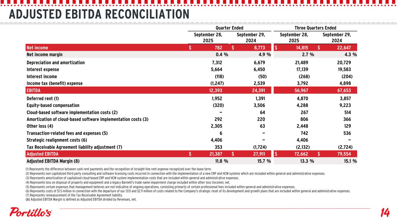 ADJUSTED EBITDA RECONCILIATION (1) Represents the difference between cash rent payments and the recognition of straight-line rent expense recognized over the lease term. (2) Represents non-capitalized third party consulting and software licensing costs incurred in connection with the implementation of a new ERP and HCM systems which are included within general and administrative expenses. (3) Represents amortization of capitalized cloud-based ERP and HCM system implementation costs that are included within general and administrative expenses. (4) Represents loss on disposal of property and equipment and a legacy Barnelli's trade name impairment charge included within other loss (income), net. (5) Represents certain expenses that management believes are not indicative of ongoing operations, consisting primarily of certain professional fees included within general and administrative expenses. (6) Represents costs of $1.5 million in connection with the departure of our CEO and $2.9 million of costs related to the Company's strategic reset of its development and growth plans that are included within general and administrative expenses. (7) Represents remeasurement of the Tax Receivable Agreement liability. (8) Adjusted EBITDA Margin is defined as Adjusted EBITDA divided by Revenues, net. Quarter Ended Three Quarters Ended September 28, 2025 September 29, 2024 September 28, 2025 September 29, 2024 Net income $ 782 $ 8,773 $ 14,815 $ 22,647 Net income margin 0.4 % 4.9 % 2.7 % 4.3 % Depreciation and amortization 7,312 6,679 21,489 20,729 Interest expense 5,664 6,450 17,139 19,583 Interest income (118) (50) (268) (204) Income tax (benefit) expense (1,247) 2,539 3,792 4,898 EBITDA 12,393 24,391 56,967 67,653 Deferred rent (1) 1,952 1,391 4,870 3,857 Equity-based compensation (320) 3,506 4,288 9,223 Cloud-based software implementation costs (2) — 64 267 514 Amortization of cloud-based software implementation costs (3) 292 220 806 366 Other loss (4) 2,305 63 2,448 129 Transaction-related fees and expenses (5) 6 — 742 536 Strategic realignment costs (6) 4,406 — 4,406 — Tax Receivable Agreement liability adjustment (7) 353 (1,724) (2,132) (2,724) Adjusted EBITDA $ 21,387 $ 27,911 $ 72,662 $ 79,554 Adjusted EBITDA Margin (8) 11.8 % 15.7 % 13.3 % 15.1 %