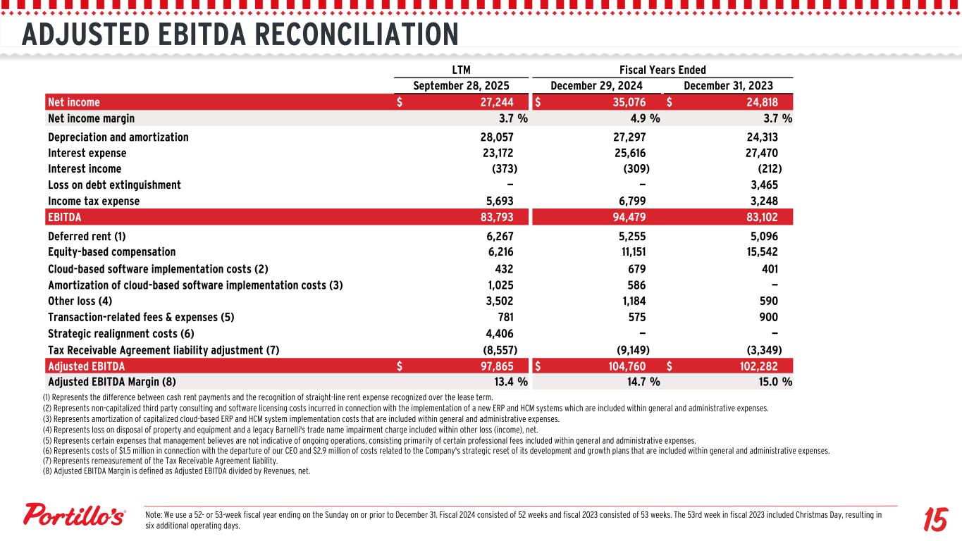 LTM Fiscal Years Ended September 28, 2025 December 29, 2024 December 31, 2023 Net income $ 27,244 $ 35,076 $ 24,818 Net income margin 3.7 % 4.9 % 3.7 % Depreciation and amortization 28,057 27,297 24,313 Interest expense 23,172 25,616 27,470 Interest income (373) (309) (212) Loss on debt extinguishment — — 3,465 Income tax expense 5,693 6,799 3,248 EBITDA 83,793 94,479 83,102 Deferred rent (1) 6,267 5,255 5,096 Equity-based compensation 6,216 11,151 15,542 Cloud-based software implementation costs (2) 432 679 401 Amortization of cloud-based software implementation costs (3) 1,025 586 — Other loss (4) 3,502 1,184 590 Transaction-related fees & expenses (5) 781 575 900 Strategic realignment costs (6) 4,406 — — Tax Receivable Agreement liability adjustment (7) (8,557) (9,149) (3,349) Adjusted EBITDA $ 97,865 $ 104,760 $ 102,282 Adjusted EBITDA Margin (8) 13.4 % 14.7 % 15.0 % ADJUSTED EBITDA RECONCILIATION (1) Represents the difference between cash rent payments and the recognition of straight-line rent expense recognized over the lease term. (2) Represents non-capitalized third party consulting and software licensing costs incurred in connection with the implementation of a new ERP and HCM systems which are included within general and administrative expenses. (3) Represents amortization of capitalized cloud-based ERP and HCM system implementation costs that are included within general and administrative expenses. (4) Represents loss on disposal of property and equipment and a legacy Barnelli's trade name impairment charge included within other loss (income), net. (5) Represents certain expenses that management believes are not indicative of ongoing operations, consisting primarily of certain professional fees included within general and administrative expenses. (6) Represents costs of $1.5 million in connection with the departure of our CEO and $2.9 million of costs related to the Company's strategic reset of its development and growth plans that are included within general and administrative expenses. (7) Represents remeasurement of the Tax Receivable Agreement liability. (8) Adjusted EBITDA Margin is defined as Adjusted EBITDA divided by Revenues, net. Note: We use a 52- or 53-week fiscal year ending on the Sunday on or prior to December 31. Fiscal 2024 consisted of 52 weeks and fiscal 2023 consisted of 53 weeks. The 53rd week in fiscal 2023 included Christmas Day, resulting in six additional operating days.
