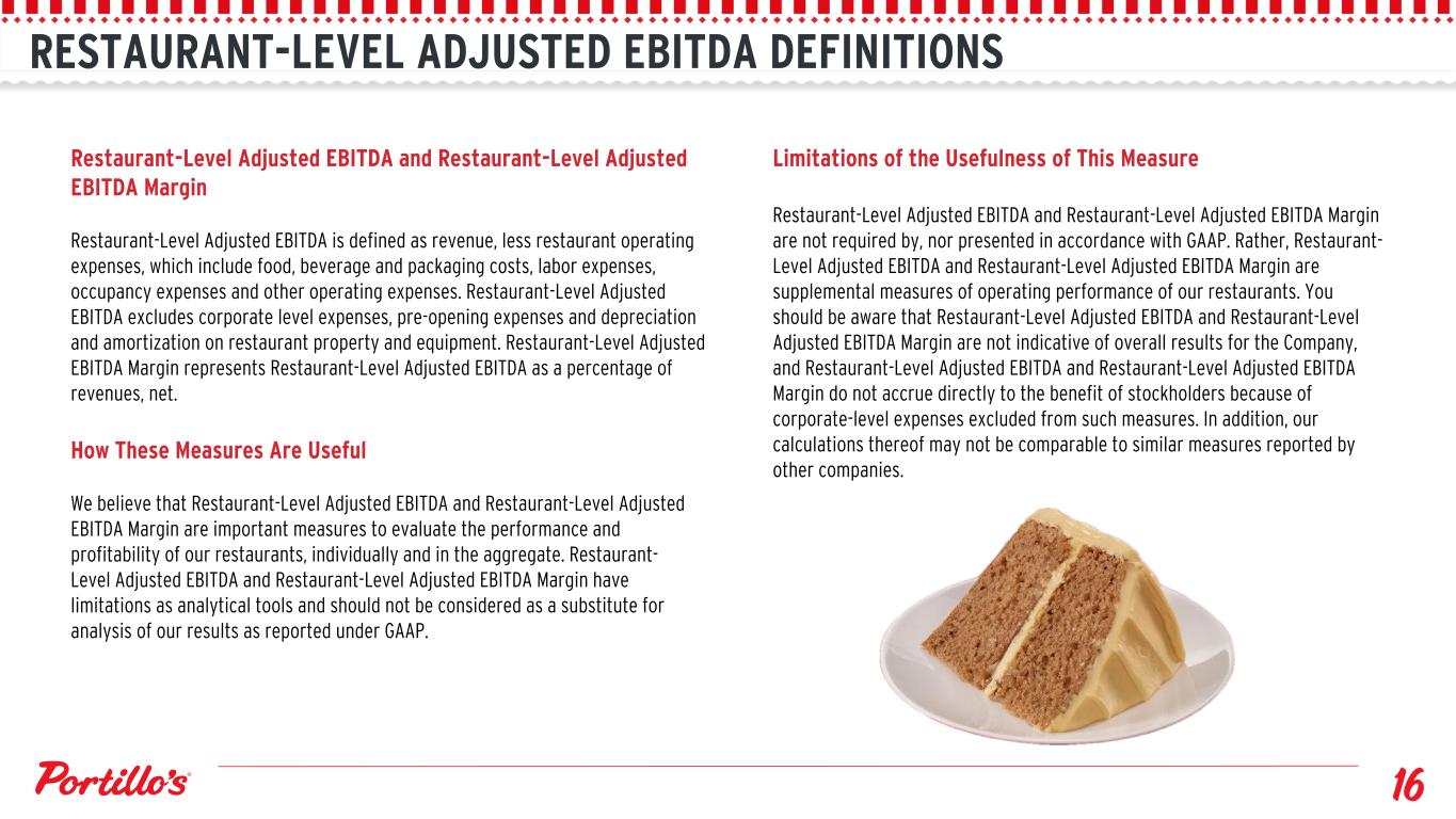 RESTAURANT-LEVEL ADJUSTED EBITDA DEFINITIONS Restaurant-Level Adjusted EBITDA and Restaurant-Level Adjusted EBITDA Margin Restaurant-Level Adjusted EBITDA is defined as revenue, less restaurant operating expenses, which include food, beverage and packaging costs, labor expenses, occupancy expenses and other operating expenses. Restaurant-Level Adjusted EBITDA excludes corporate level expenses, pre-opening expenses and depreciation and amortization on restaurant property and equipment. Restaurant-Level Adjusted EBITDA Margin represents Restaurant-Level Adjusted EBITDA as a percentage of revenues, net. How These Measures Are Useful We believe that Restaurant-Level Adjusted EBITDA and Restaurant-Level Adjusted EBITDA Margin are important measures to evaluate the performance and profitability of our restaurants, individually and in the aggregate. Restaurant- Level Adjusted EBITDA and Restaurant-Level Adjusted EBITDA Margin have limitations as analytical tools and should not be considered as a substitute for analysis of our results as reported under GAAP. Limitations of the Usefulness of This Measure Restaurant-Level Adjusted EBITDA and Restaurant-Level Adjusted EBITDA Margin are not required by, nor presented in accordance with GAAP. Rather, Restaurant- Level Adjusted EBITDA and Restaurant-Level Adjusted EBITDA Margin are supplemental measures of operating performance of our restaurants. You should be aware that Restaurant-Level Adjusted EBITDA and Restaurant-Level Adjusted EBITDA Margin are not indicative of overall results for the Company, and Restaurant-Level Adjusted EBITDA and Restaurant-Level Adjusted EBITDA Margin do not accrue directly to the benefit of stockholders because of corporate-level expenses excluded from such measures. In addition, our calculations thereof may not be comparable to similar measures reported by other companies.