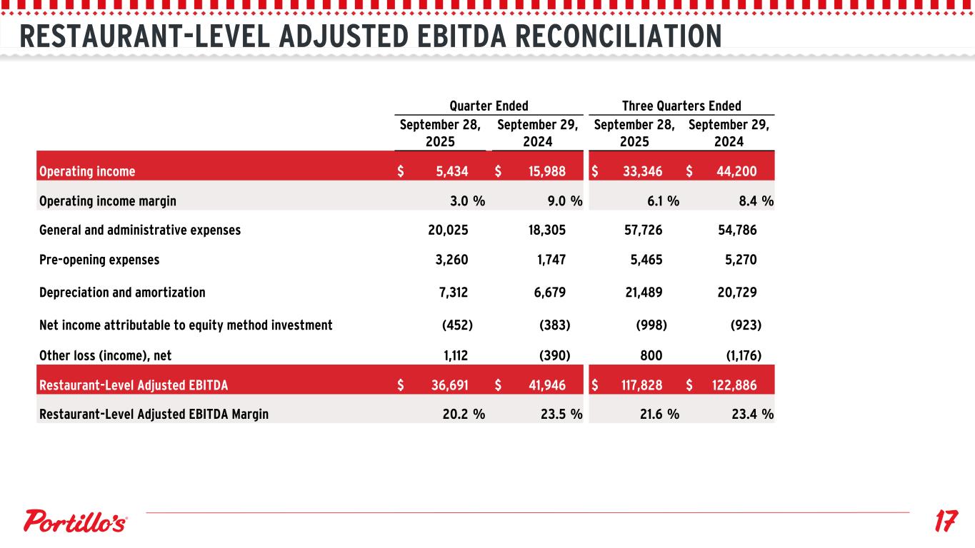 RESTAURANT-LEVEL ADJUSTED EBITDA RECONCILIATION Quarter Ended Three Quarters Ended September 28, 2025 September 29, 2024 September 28, 2025 September 29, 2024 Operating income $ 5,434 $ 15,988 $ 33,346 $ 44,200 Operating income margin 3.0 % 9.0 % 6.1 % 8.4 % General and administrative expenses 20,025 18,305 57,726 54,786 Pre-opening expenses 3,260 1,747 5,465 5,270 Depreciation and amortization 7,312 6,679 21,489 20,729 Net income attributable to equity method investment (452) (383) (998) (923) Other loss (income), net 1,112 (390) 800 (1,176) Restaurant-Level Adjusted EBITDA $ 36,691 $ 41,946 $ 117,828 $ 122,886 Restaurant-Level Adjusted EBITDA Margin 20.2 % 23.5 % 21.6 % 23.4 %