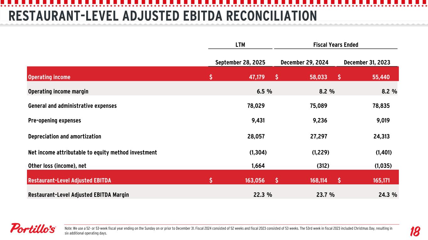 RESTAURANT-LEVEL ADJUSTED EBITDA RECONCILIATION LTM Fiscal Years Ended September 28, 2025 December 29, 2024 December 31, 2023 Operating income $ 47,179 $ 58,033 $ 55,440 Operating income margin 6.5 % 8.2 % 8.2 % General and administrative expenses 78,029 75,089 78,835 Pre-opening expenses 9,431 9,236 9,019 Depreciation and amortization 28,057 27,297 24,313 Net income attributable to equity method investment (1,304) (1,229) (1,401) Other loss (income), net 1,664 (312) (1,035) Restaurant-Level Adjusted EBITDA $ 163,056 $ 168,114 $ 165,171 Restaurant-Level Adjusted EBITDA Margin 22.3 % 23.7 % 24.3 % Note: We use a 52- or 53-week fiscal year ending on the Sunday on or prior to December 31. Fiscal 2024 consisted of 52 weeks and fiscal 2023 consisted of 53 weeks. The 53rd week in fiscal 2023 included Christmas Day, resulting in six additional operating days.