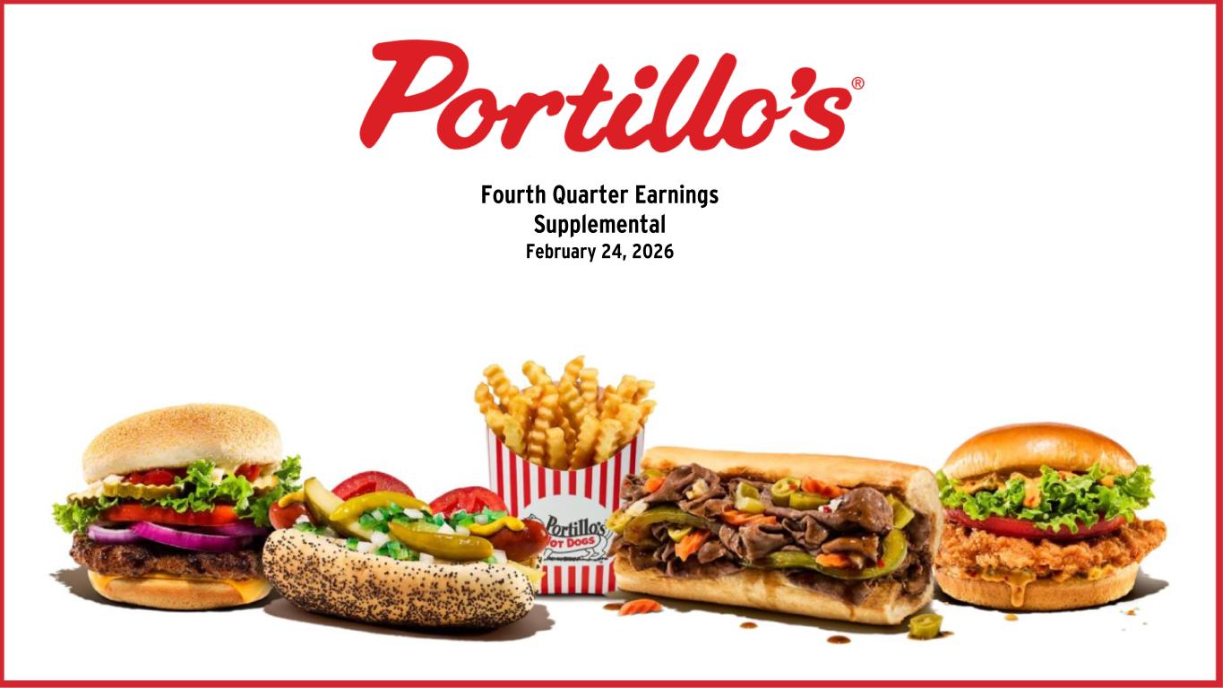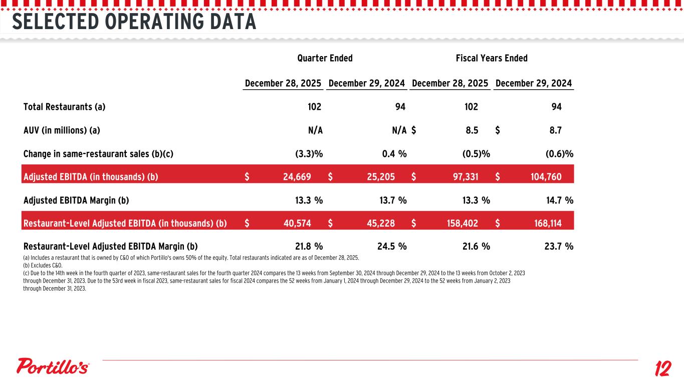 SELECTED OPERATING DATA (a) Includes a restaurant that is owned by C&O of which Portillo's owns 50% of the equity. Total restaurants indicated are as of December 28, 2025. (b) Excludes C&O. (c) Due to the 14th week in the fourth quarter of 2023, same-restaurant sales for the fourth quarter 2024 compares the 13 weeks from September 30, 2024 through December 29, 2024 to the 13 weeks from October 2, 2023 through December 31, 2023. Due to the 53rd week in fiscal 2023, same-restaurant sales for fiscal 2024 compares the 52 weeks from January 1, 2024 through December 29, 2024 to the 52 weeks from January 2, 2023 through December 31, 2023. Quarter Ended Fiscal Years Ended December 28, 2025 December 29, 2024 December 28, 2025 December 29, 2024 Total Restaurants (a) 102 94 102 94 AUV (in millions) (a) N/A N/A $ 8.5 $ 8.7 Change in same-restaurant sales (b)(c) (3.3) % 0.4 % (0.5) % (0.6) % Adjusted EBITDA (in thousands) (b) $ 24,669 $ 25,205 $ 97,331 $ 104,760 Adjusted EBITDA Margin (b) 13.3 % 13.7 % 13.3 % 14.7 % Restaurant-Level Adjusted EBITDA (in thousands) (b) $ 40,574 $ 45,228 $ 158,402 $ 168,114 Restaurant-Level Adjusted EBITDA Margin (b) 21.8 % 24.5 % 21.6 % 23.7 %