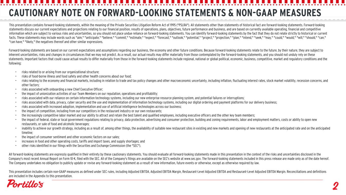 CAUTIONARY NOTE ON FORWARD-LOOKING STATEMENTS & NON-GAAP MEASURES This presentation contains forward-looking statements, within the meaning of the Private Securities Litigation Reform Act of 1995 ("PSLRA"). All statements other than statements of historical fact are forward-looking statements. Forward-looking statements discuss our current expectations and projections relating to our financial position, results of operations, plans, objectives, future performance and business, and are based on currently available operating, financial and competitive information which are subject to various risks and uncertainties, so you should not place undue reliance on forward-looking statements. You can identify forward-looking statements by the fact that they do not relate strictly to historical or current facts. These statements may include words such as "aim," "anticipate," "believe," "commit," "estimate," "expect," "forecast," "outlook," "potential," "project," "projection," "plan," "intend," "seek," "may," "could," "would," "will," "should," "can," "can have," "likely," the negatives thereof and other similar expressions. Forward-looking statements are based on our current expectations and assumptions regarding our business, the economy and other future conditions. Because forward-looking statements relate to the future, by their nature, they are subject to inherent uncertainties, risks and changes in circumstances that we may not predict. As a result, our actual results may differ materially from those contemplated by the forward-looking statements, and you should not unduly rely on these statements. Important factors that could cause actual results to differ materially from those in the forward-looking statements include regional, national or global political, economic, business, competitive, market and regulatory conditions and the following: • risks related to or arising from our organizational structure; • risks of food-borne illness and food safety and other health concerns about our food; • risks relating to the economy and financial markets, including in relation to trade and tax policy changes and other macroeconomic uncertainty, including inflation, fluctuating interest rates, stock market volatility, recession concerns, and other factors; • risks associated with onboarding a new Chief Executive Officer; • the impact of unionization activities of our Team Members on our reputation, operations and profitability; • risks associated with our reliance on certain information technology systems, including our new enterprise resource planning system, and potential failures or interruptions; • risks associated with data, privacy, cyber security and the use and implementation of information technology systems, including our digital ordering and payment platforms for our delivery business; • risks associated with increased adoption, implementation and use of artificial intelligence technologies across our business; • the impact of competition, including from our competitors in the restaurant industry or our own restaurants; • the increasingly competitive labor market and our ability to attract and retain the best talent and qualified employees, including executive officers and the other key team members; • the impact of federal, state or local government regulations relating to privacy, data protection, advertising and consumer protection, building and zoning requirements, labor and employment matters, costs or ability to open new restaurants, or sale of food and alcoholic beverages; • inability to achieve our growth strategy, including as a result of, among other things, the availability of suitable new restaurant sites in existing and new markets and opening of new restaurants at the anticipated rate and on the anticipated timeline; • the impact of consumer sentiment and other economic factors on our sales; • increases in food and other operating costs, tariffs and import taxes, and supply shortages; and • other risks identified in our filings with the Securities and Exchange Commission (the "SEC"). All forward-looking statements are expressly qualified in their entirety by these cautionary statements. You should evaluate all forward-looking statements made in this presentation in the context of the risks and uncertainties disclosed in the Company's most recent Annual Report on Form 10-K, filed with the SEC. All of the Company's filings are available on the SEC's website at www.sec.gov. The forward-looking statements included in this press release are made only as of the date hereof. The Company undertakes no obligation to publicly update or revise any forward-looking statement as a result of new information, future events or otherwise, except as otherwise required by law. This presentation includes certain non-GAAP measures as defined under SEC rules, including Adjusted EBITDA, Adjusted EBITDA Margin, Restaurant-Level Adjusted EBITDA and Restaurant-Level Adjusted EBITDA Margin. Reconciliations and definitions are included in the Appendix to this presentation.