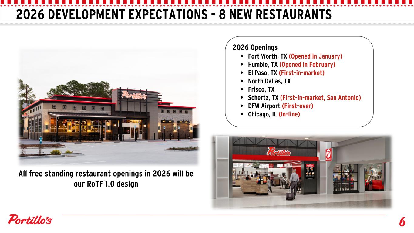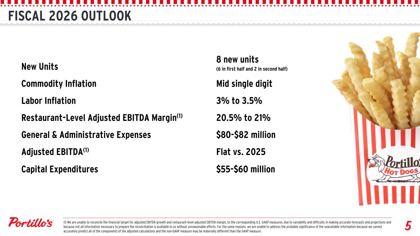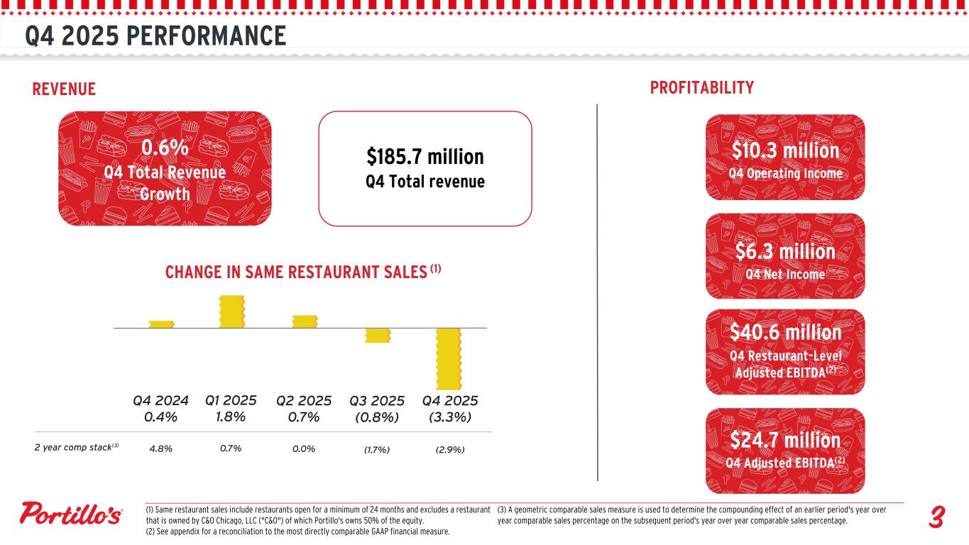 Q4 2025 PERFORMANCE REVENUE $185.7 million Q4 Total revenue CHANGE IN SAME RESTAURANT SALES (1) PROFITABILITY $10.3 million Q4 Operating Income 0.6% Q4 Total Revenue Growth (3) A geometric comparable sales measure is used to determine the compounding effect of an earlier period's year over year comparable sales percentage on the subsequent period's year over year comparable sales percentage. $24.7 million Q4 Adjusted EBITDA(2) $40.6 million Q4 Restaurant-Level Adjusted EBITDA(2) $6.3 million Q4 Net Income (1) Same restaurant sales include restaurants open for a minimum of 24 months and excludes a restaurant that is owned by C&O Chicago, LLC ("C&O") of which Portillo's owns 50% of the equity. (2) See appendix for a reconciliation to the most directly comparable GAAP financial measure.