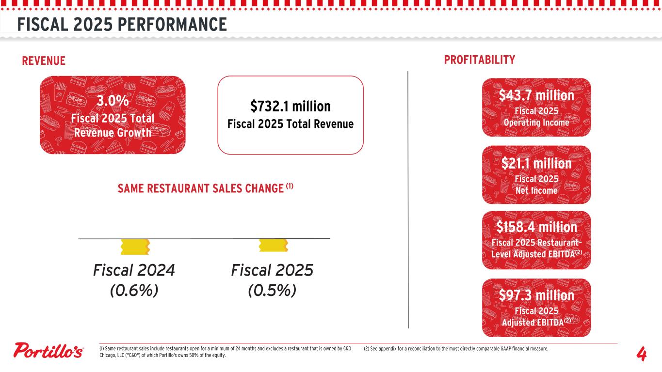 FISCAL 2025 PERFORMANCE REVENUE $732.1 million Fiscal 2025 Total Revenue SAME RESTAURANT SALES CHANGE (1) PROFITABILITY $43.7 million Fiscal 2025 Operating Income 3.0% Fiscal 2025 Total Revenue Growth (2) See appendix for a reconciliation to the most directly comparable GAAP financial measure. $97.3 million Fiscal 2025 Adjusted EBITDA(2) $158.4 million Fiscal 2025 Restaurant- Level Adjusted EBITDA(2) $21.1 million Fiscal 2025 Net Income (1) Same restaurant sales include restaurants open for a minimum of 24 months and excludes a restaurant that is owned by C&O Chicago, LLC ("C&O") of which Portillo's owns 50% of the equity.