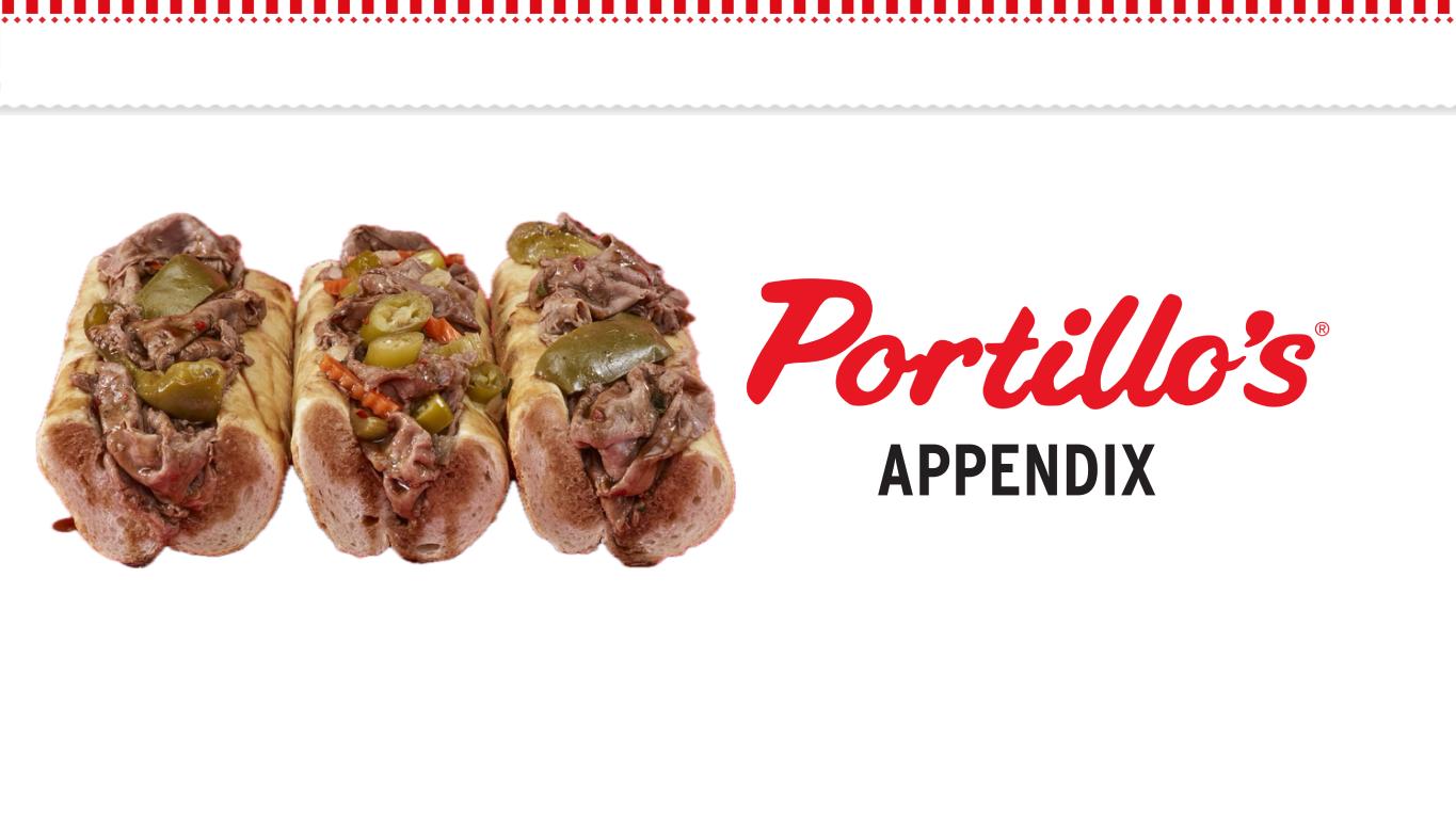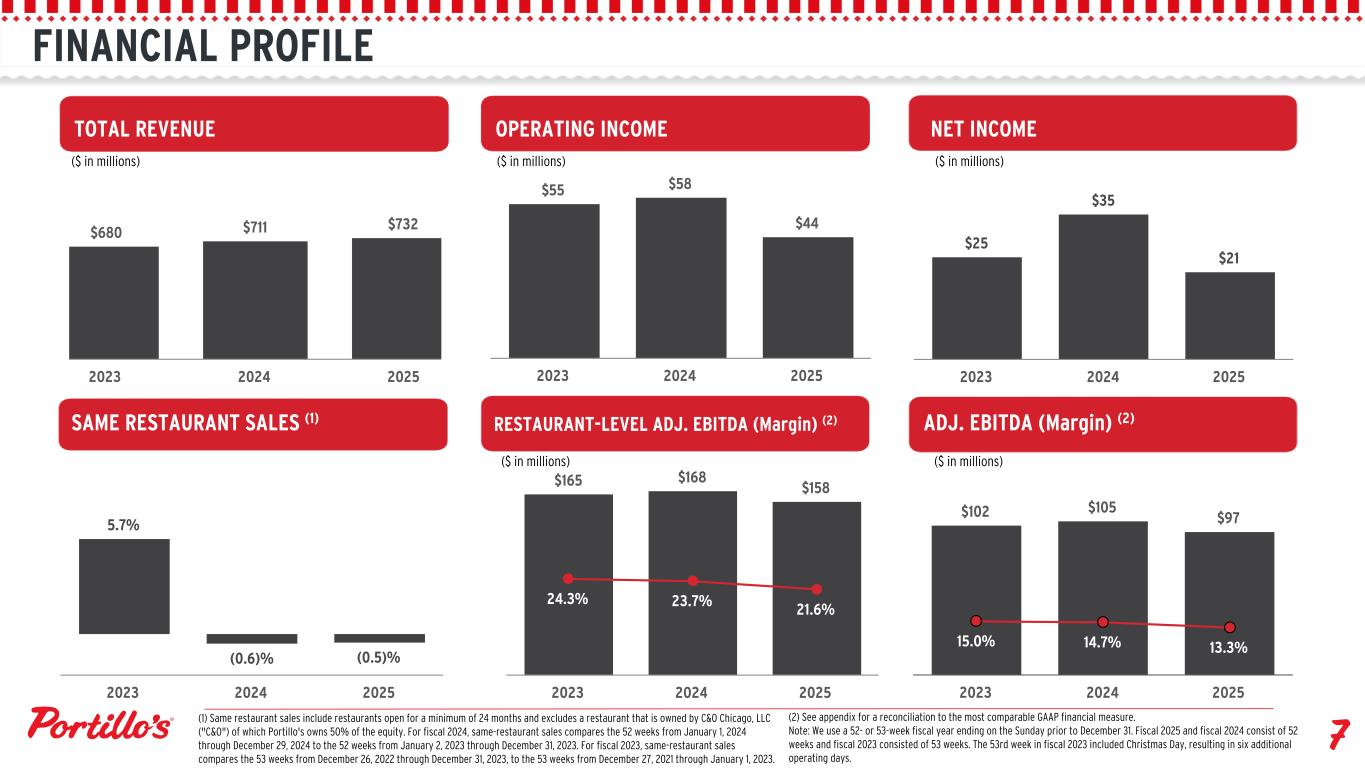 FINANCIAL PROFILE $55 $58 $44 2023 2024 2025 $165 $168 $158 24.3% 23.7% 21.6% 2023 2024 2025 $25 $35 $21 2023 2024 2025 $102 $105 $97 15.0% 14.7% 13.3% 2023 2024 2025 $680 $711 $732 2023 2024 2025 5.7% (0.6)% (0.5)% 2023 2024 2025 TOTAL REVENUE OPERATING INCOME NET INCOME SAME RESTAURANT SALES (1) RESTAURANT-LEVEL ADJ. EBITDA (Margin) (2) ADJ. EBITDA (Margin) (2) ($ in millions) ($ in millions) ($ in millions) ($ in millions) ($ in millions) (1) Same restaurant sales include restaurants open for a minimum of 24 months and excludes a restaurant that is owned by C&O Chicago, LLC ("C&O") of which Portillo's owns 50% of the equity. For fiscal 2024, same-restaurant sales compares the 52 weeks from January 1, 2024 through December 29, 2024 to the 52 weeks from January 2, 2023 through December 31, 2023. For fiscal 2023, same-restaurant sales compares the 53 weeks from December 26, 2022 through December 31, 2023, to the 53 weeks from December 27, 2021 through January 1, 2023. (2) See appendix for a reconciliation to the most comparable GAAP financial measure. Note: We use a 52- or 53-week fiscal year ending on the Sunday prior to December 31. Fiscal 2025 and fiscal 2024 consist of 52 weeks and fiscal 2023 consisted of 53 weeks. The 53rd week in fiscal 2023 included Christmas Day, resulting in six additional operating days.