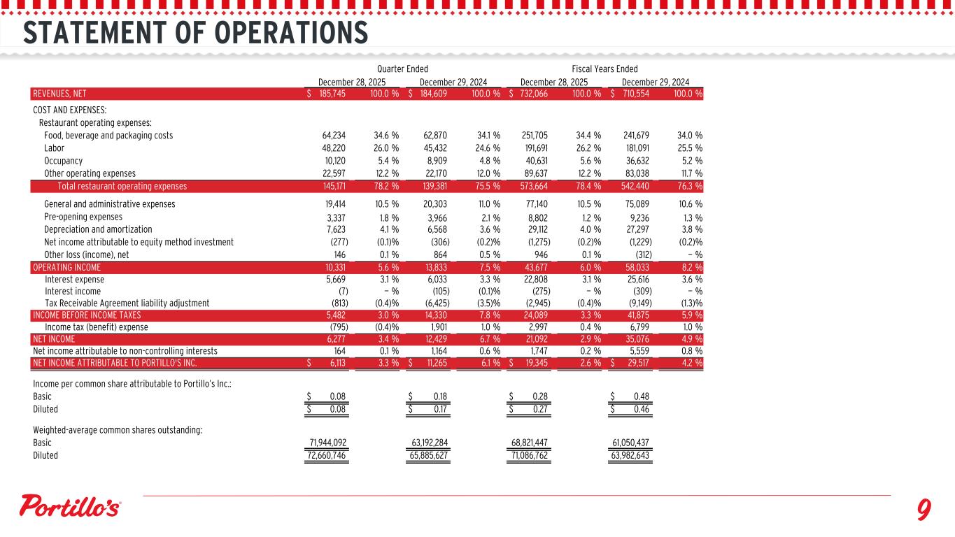 STATEMENT OF OPERATIONS Quarter Ended Fiscal Years Ended December 28, 2025 December 29, 2024 December 28, 2025 December 29, 2024 REVENUES, NET $ 185,745 100.0 % $ 184,609 100.0 % $ 732,066 100.0 % $ 710,554 100.0 % COST AND EXPENSES: Restaurant operating expenses: Food, beverage and packaging costs 64,234 34.6 % 62,870 34.1 % 251,705 34.4 % 241,679 34.0 % Labor 48,220 26.0 % 45,432 24.6 % 191,691 26.2 % 181,091 25.5 % Occupancy 10,120 5.4 % 8,909 4.8 % 40,631 5.6 % 36,632 5.2 % Other operating expenses 22,597 12.2 % 22,170 12.0 % 89,637 12.2 % 83,038 11.7 % Total restaurant operating expenses 145,171 78.2 % 139,381 75.5 % 573,664 78.4 % 542,440 76.3 % General and administrative expenses 19,414 10.5 % 20,303 11.0 % 77,140 10.5 % 75,089 10.6 % Pre-opening expenses 3,337 1.8 % 3,966 2.1 % 8,802 1.2 % 9,236 1.3 % Depreciation and amortization 7,623 4.1 % 6,568 3.6 % 29,112 4.0 % 27,297 3.8 % Net income attributable to equity method investment (277) (0.1) % (306) (0.2) % (1,275) (0.2) % (1,229) (0.2) % Other loss (income), net 146 0.1 % 864 0.5 % 946 0.1 % (312) — % OPERATING INCOME 10,331 5.6 % 13,833 7.5 % 43,677 6.0 % 58,033 8.2 % Interest expense 5,669 3.1 % 6,033 3.3 % 22,808 3.1 % 25,616 3.6 % Interest income (7) — % (105) (0.1) % (275) — % (309) — % Tax Receivable Agreement liability adjustment (813) (0.4) % (6,425) (3.5) % (2,945) (0.4) % (9,149) (1.3) % INCOME BEFORE INCOME TAXES 5,482 3.0 % 14,330 7.8 % 24,089 3.3 % 41,875 5.9 % Income tax (benefit) expense (795) (0.4) % 1,901 1.0 % 2,997 0.4 % 6,799 1.0 % NET INCOME 6,277 3.4 % 12,429 6.7 % 21,092 2.9 % 35,076 4.9 % Net income attributable to non-controlling interests 164 0.1 % 1,164 0.6 % 1,747 0.2 % 5,559 0.8 % NET INCOME ATTRIBUTABLE TO PORTILLO'S INC. $ 6,113 3.3 % $ 11,265 6.1 % $ 19,345 2.6 % $ 29,517 4.2 % Income per common share attributable to Portillo’s Inc.: Basic $ 0.08 $ 0.18 $ 0.28 $ 0.48 Diluted $ 0.08 $ 0.17 $ 0.27 $ 0.46 Weighted-average common shares outstanding: Basic 71,944,092 63,192,284 68,821,447 61,050,437 Diluted 72,660,746 65,885,627 71,086,762 63,982,643