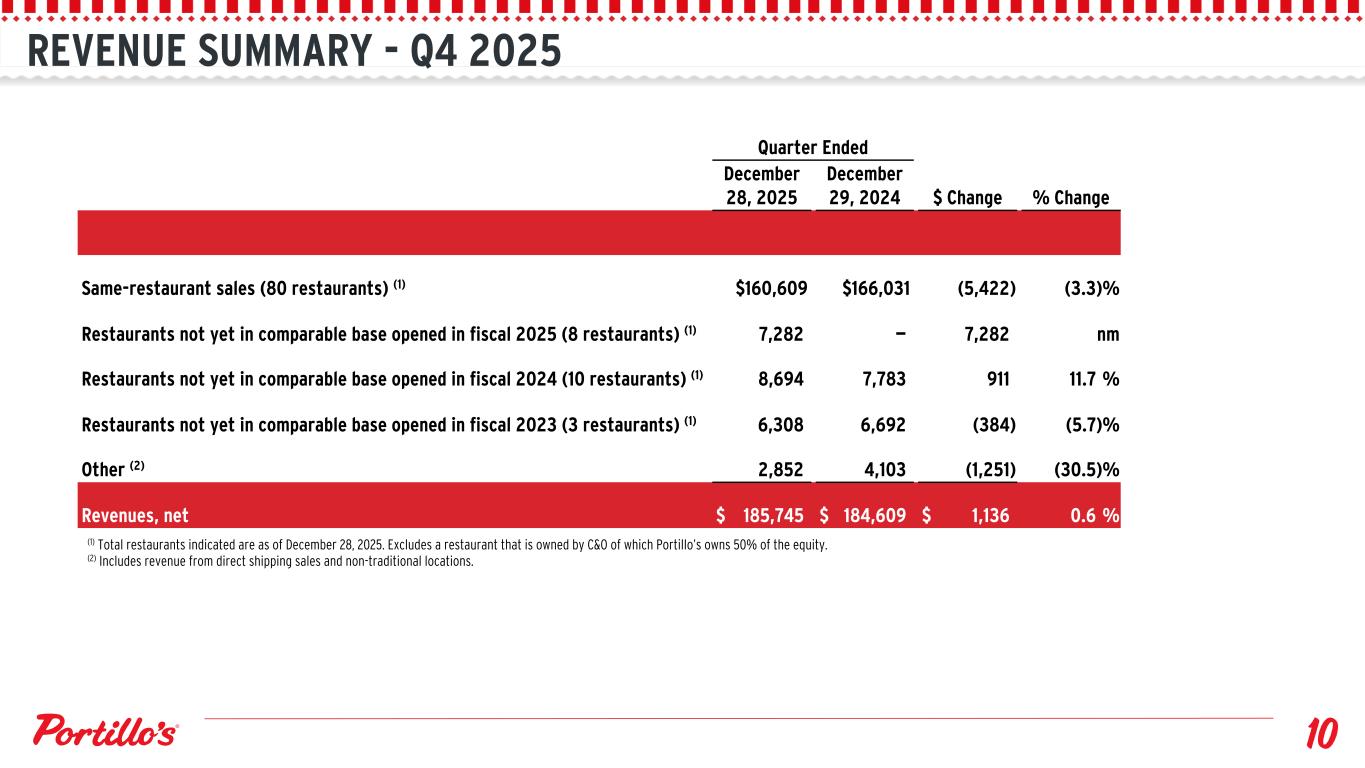 REVENUE SUMMARY - Q4 2025 Quarter Ended December 28, 2025 December 29, 2024 $ Change % Change Same-restaurant sales (80 restaurants) (1) $160,609 $166,031 (5,422) (3.3) % Restaurants not yet in comparable base opened in fiscal 2025 (8 restaurants) (1) 7,282 — 7,282 nm Restaurants not yet in comparable base opened in fiscal 2024 (10 restaurants) (1) 8,694 7,783 911 11.7 % Restaurants not yet in comparable base opened in fiscal 2023 (3 restaurants) (1) 6,308 6,692 (384) (5.7) % Other (2) 2,852 4,103 (1,251) (30.5) % Revenues, net $ 185,745 $ 184,609 $ 1,136 0.6 % (1) Total restaurants indicated are as of December 28, 2025. Excludes a restaurant that is owned by C&O of which Portillo’s owns 50% of the equity. (2) Includes revenue from direct shipping sales and non-traditional locations. TAKEAWAYS