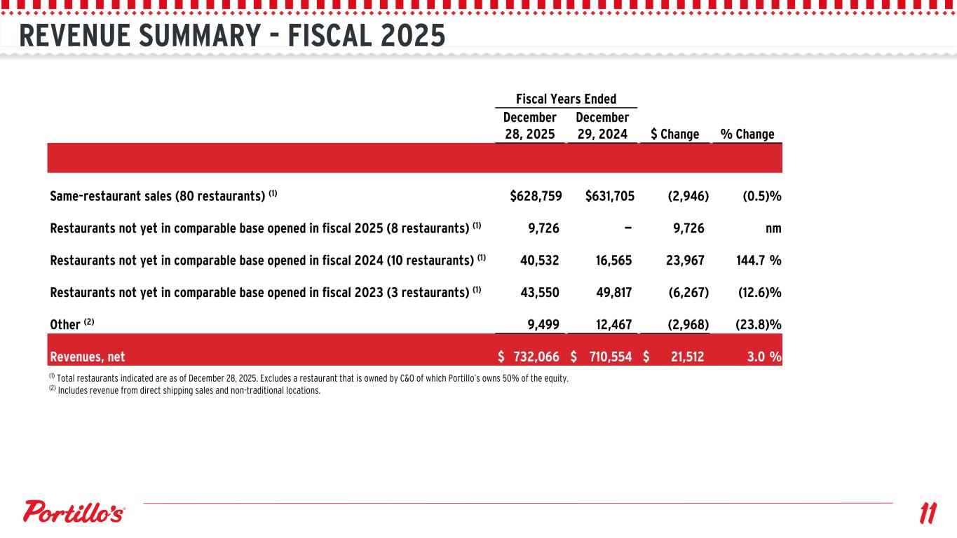 REVENUE SUMMARY - FISCAL 2025 Fiscal Years Ended December 28, 2025 December 29, 2024 $ Change % Change Same-restaurant sales (80 restaurants) (1) $628,759 $631,705 (2,946) (0.5) % Restaurants not yet in comparable base opened in fiscal 2025 (8 restaurants) (1) 9,726 — 9,726 nm Restaurants not yet in comparable base opened in fiscal 2024 (10 restaurants) (1) 40,532 16,565 23,967 144.7 % Restaurants not yet in comparable base opened in fiscal 2023 (3 restaurants) (1) 43,550 49,817 (6,267) (12.6) % Other (2) 9,499 12,467 (2,968) (23.8) % Revenues, net $ 732,066 $ 710,554 $ 21,512 3.0 % (1) Total restaurants indicated are as of December 28, 2025. Excludes a restaurant that is owned by C&O of which Portillo’s owns 50% of the equity. (2) Includes revenue from direct shipping sales and non-traditional locations.