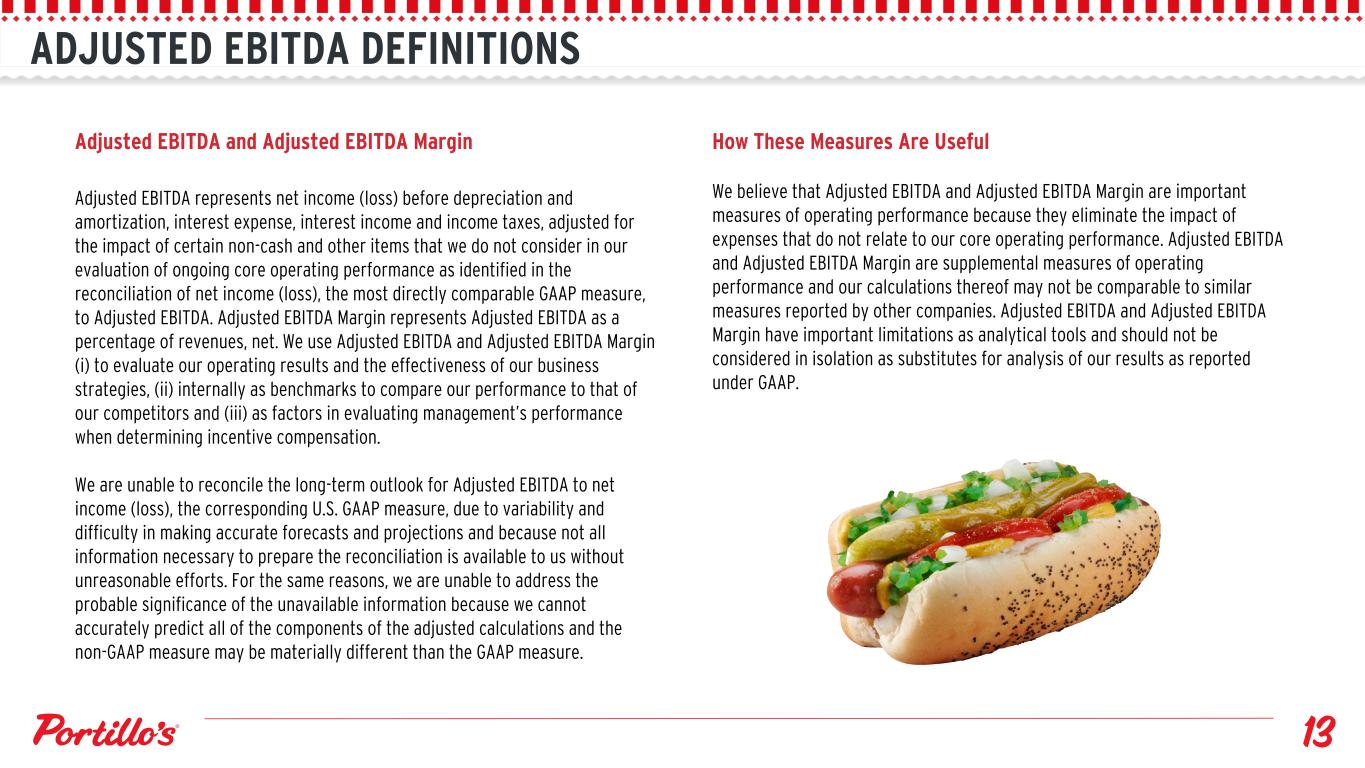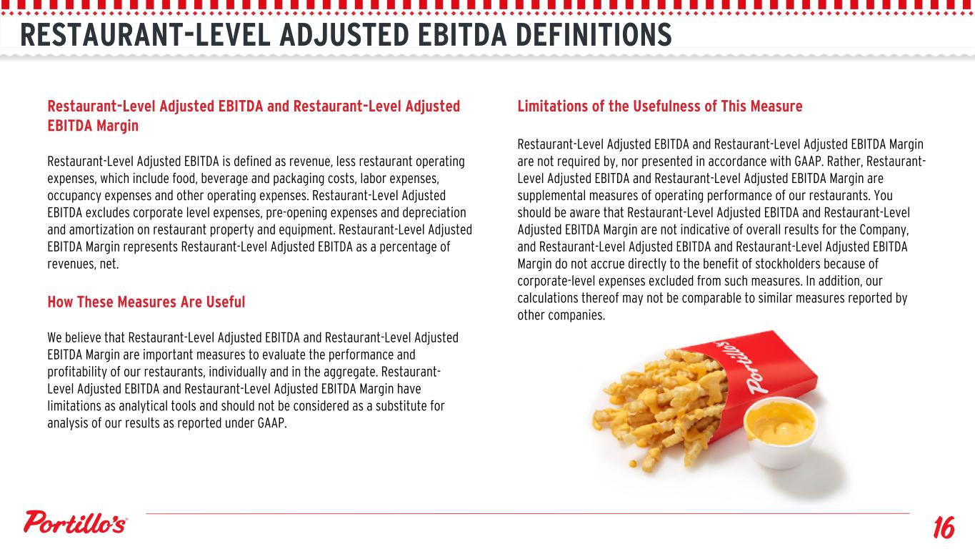 RESTAURANT-LEVEL ADJUSTED EBITDA DEFINITIONS Restaurant-Level Adjusted EBITDA and Restaurant-Level Adjusted EBITDA Margin Restaurant-Level Adjusted EBITDA is defined as revenue, less restaurant operating expenses, which include food, beverage and packaging costs, labor expenses, occupancy expenses and other operating expenses. Restaurant-Level Adjusted EBITDA excludes corporate level expenses, pre-opening expenses and depreciation and amortization on restaurant property and equipment. Restaurant-Level Adjusted EBITDA Margin represents Restaurant-Level Adjusted EBITDA as a percentage of revenues, net. How These Measures Are Useful We believe that Restaurant-Level Adjusted EBITDA and Restaurant-Level Adjusted EBITDA Margin are important measures to evaluate the performance and profitability of our restaurants, individually and in the aggregate. Restaurant- Level Adjusted EBITDA and Restaurant-Level Adjusted EBITDA Margin have limitations as analytical tools and should not be considered as a substitute for analysis of our results as reported under GAAP. Limitations of the Usefulness of This Measure Restaurant-Level Adjusted EBITDA and Restaurant-Level Adjusted EBITDA Margin are not required by, nor presented in accordance with GAAP. Rather, Restaurant- Level Adjusted EBITDA and Restaurant-Level Adjusted EBITDA Margin are supplemental measures of operating performance of our restaurants. You should be aware that Restaurant-Level Adjusted EBITDA and Restaurant-Level Adjusted EBITDA Margin are not indicative of overall results for the Company, and Restaurant-Level Adjusted EBITDA and Restaurant-Level Adjusted EBITDA Margin do not accrue directly to the benefit of stockholders because of corporate-level expenses excluded from such measures. In addition, our calculations thereof may not be comparable to similar measures reported by other companies.