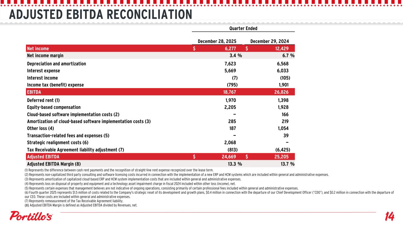 ADJUSTED EBITDA RECONCILIATION (1) Represents the difference between cash rent payments and the recognition of straight-line rent expense recognized over the lease term. (2) Represents non-capitalized third party consulting and software licensing costs incurred in connection with the implementation of a new ERP and HCM systems which are included within general and administrative expenses. (3) Represents amortization of capitalized cloud-based ERP and HCM system implementation costs that are included within general and administrative expenses. (4) Represents loss on disposal of property and equipment and a technology asset impairment charge in fiscal 2024 included within other loss (income), net. (5) Represents certain expenses that management believes are not indicative of ongoing operations, consisting primarily of certain professional fees included within general and administrative expenses. (6) Fourth quarter 2025 represents $1.5 million of costs related to the Company's strategic reset of its development and growth plans, $0.4 million in connection with the departure of our Chief Development Officer (“CDO”), and $0.2 million in connection with the departure of our CEO. These costs are included within general and administrative expenses. (7) Represents remeasurement of the Tax Receivable Agreement liability. (8) Adjusted EBITDA Margin is defined as Adjusted EBITDA divided by Revenues, net. Quarter Ended December 28, 2025 December 29, 2024 Net income $ 6,277 $ 12,429 Net income margin 3.4 % 6.7 % Depreciation and amortization 7,623 6,568 Interest expense 5,669 6,033 Interest income (7) (105) Income tax (benefit) expense (795) 1,901 EBITDA 18,767 26,826 Deferred rent (1) 1,970 1,398 Equity-based compensation 2,205 1,928 Cloud-based software implementation costs (2) — 166 Amortization of cloud-based software implementation costs (3) 285 219 Other loss (4) 187 1,054 Transaction-related fees and expenses (5) — 39 Strategic realignment costs (6) 2,068 — Tax Receivable Agreement liability adjustment (7) (813) (6,425) Adjusted EBITDA $ 24,669 $ 25,205 Adjusted EBITDA Margin (8) 13.3 % 13.7 %