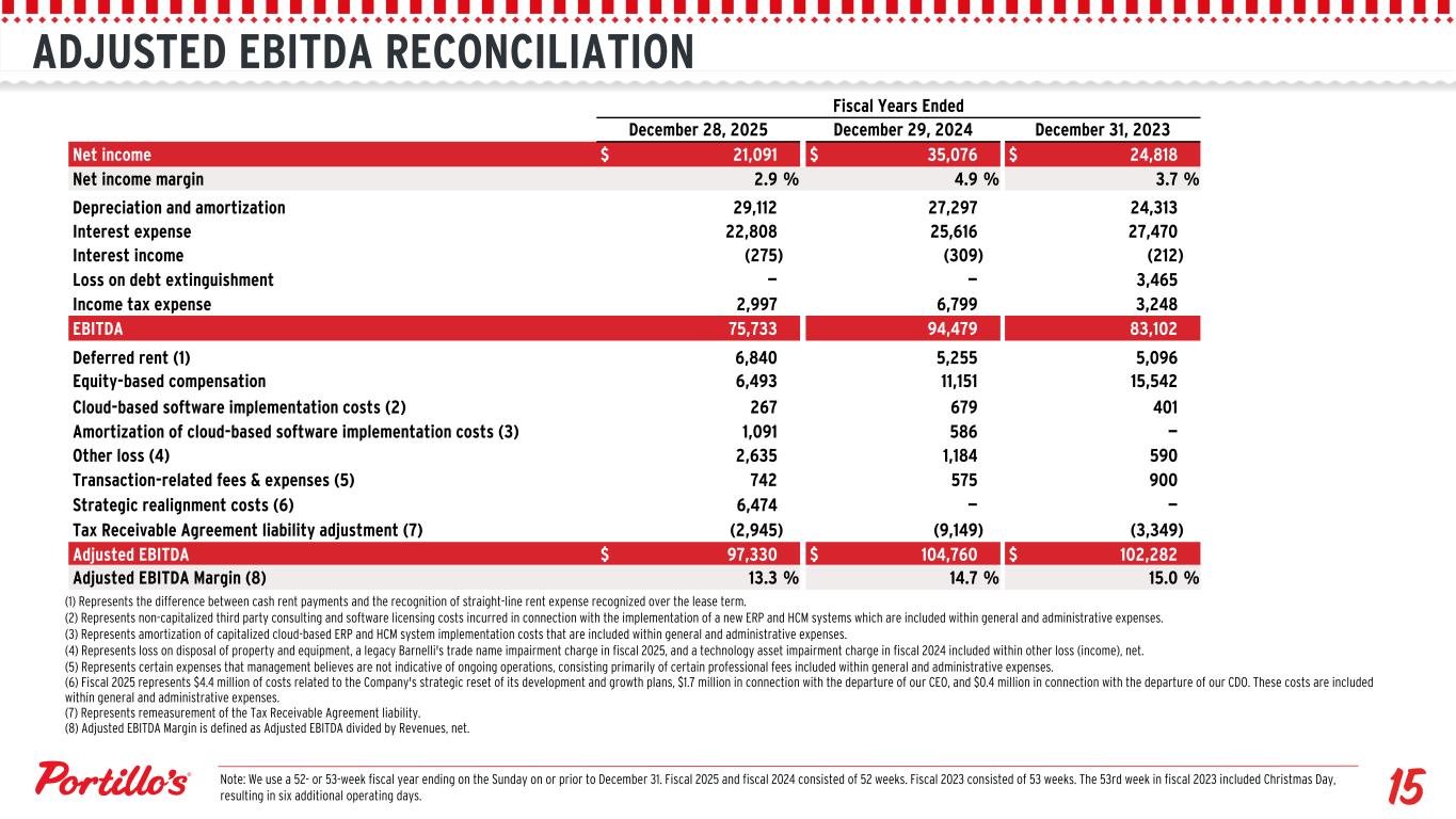 Fiscal Years Ended December 28, 2025 December 29, 2024 December 31, 2023 Net income $ 21,091 $ 35,076 $ 24,818 Net income margin 2.9 % 4.9 % 3.7 % Depreciation and amortization 29,112 27,297 24,313 Interest expense 22,808 25,616 27,470 Interest income (275) (309) (212) Loss on debt extinguishment — — 3,465 Income tax expense 2,997 6,799 3,248 EBITDA 75,733 94,479 83,102 Deferred rent (1) 6,840 5,255 5,096 Equity-based compensation 6,493 11,151 15,542 Cloud-based software implementation costs (2) 267 679 401 Amortization of cloud-based software implementation costs (3) 1,091 586 — Other loss (4) 2,635 1,184 590 Transaction-related fees & expenses (5) 742 575 900 Strategic realignment costs (6) 6,474 — — Tax Receivable Agreement liability adjustment (7) (2,945) (9,149) (3,349) Adjusted EBITDA $ 97,330 $ 104,760 $ 102,282 Adjusted EBITDA Margin (8) 13.3 % 14.7 % 15.0 % ADJUSTED EBITDA RECONCILIATION (1) Represents the difference between cash rent payments and the recognition of straight-line rent expense recognized over the lease term. (2) Represents non-capitalized third party consulting and software licensing costs incurred in connection with the implementation of a new ERP and HCM systems which are included within general and administrative expenses. (3) Represents amortization of capitalized cloud-based ERP and HCM system implementation costs that are included within general and administrative expenses. (4) Represents loss on disposal of property and equipment, a legacy Barnelli's trade name impairment charge in fiscal 2025, and a technology asset impairment charge in fiscal 2024 included within other loss (income), net. (5) Represents certain expenses that management believes are not indicative of ongoing operations, consisting primarily of certain professional fees included within general and administrative expenses. (6) Fiscal 2025 represents $4.4 million of costs related to the Company's strategic reset of its development and growth plans, $1.7 million in connection with the departure of our CEO, and $0.4 million in connection with the departure of our CDO. These costs are included within general and administrative expenses. (7) Represents remeasurement of the Tax Receivable Agreement liability. (8) Adjusted EBITDA Margin is defined as Adjusted EBITDA divided by Revenues, net. Note: We use a 52- or 53-week fiscal year ending on the Sunday on or prior to December 31. Fiscal 2025 and fiscal 2024 consisted of 52 weeks. Fiscal 2023 consisted of 53 weeks. The 53rd week in fiscal 2023 included Christmas Day, resulting in six additional operating days.