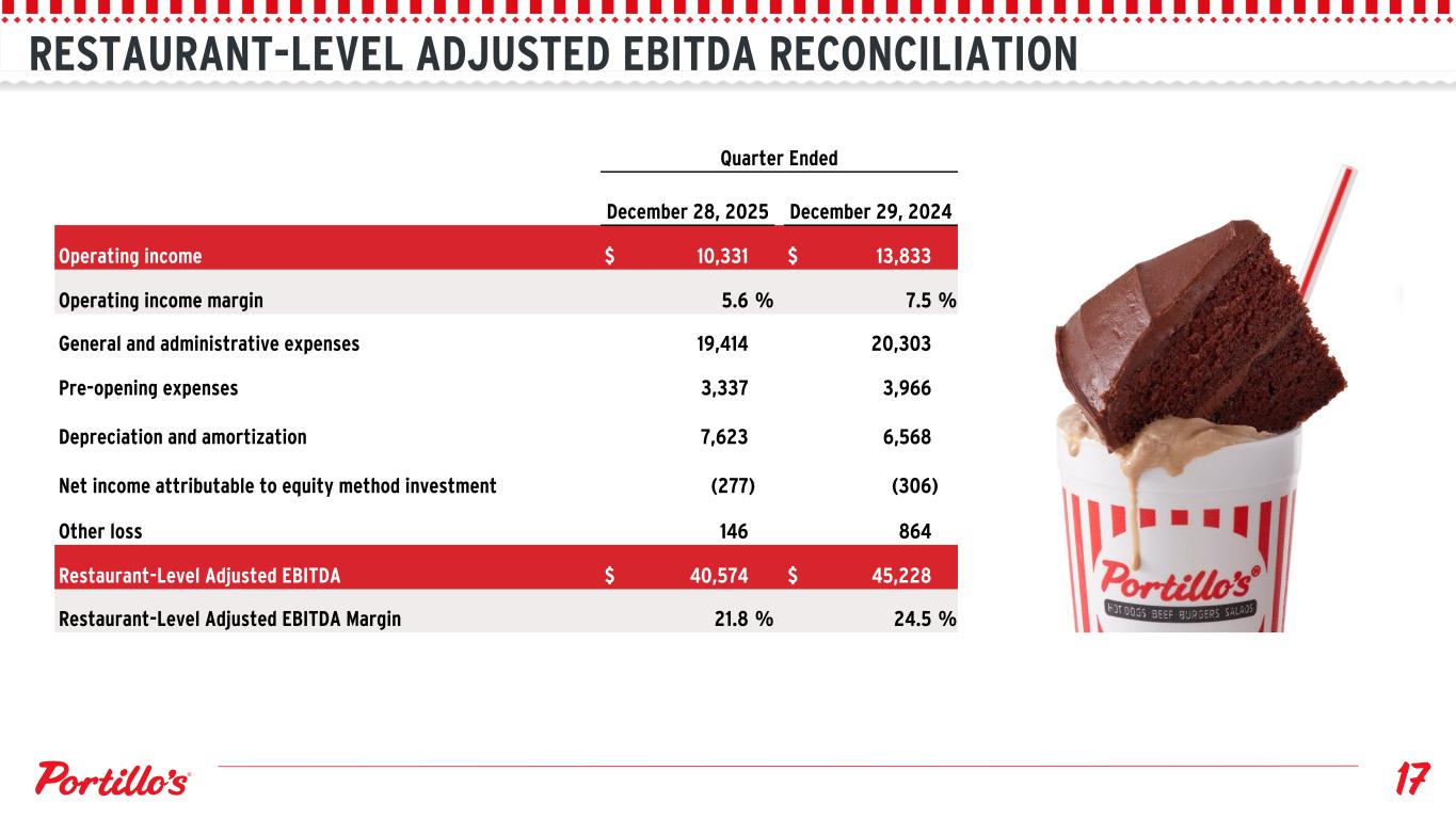 RESTAURANT-LEVEL ADJUSTED EBITDA RECONCILIATION Quarter Ended December 28, 2025 December 29, 2024 Operating income $ 10,331 $ 13,833 Operating income margin 5.6 % 7.5 % General and administrative expenses 19,414 20,303 Pre-opening expenses 3,337 3,966 Depreciation and amortization 7,623 6,568 Net income attributable to equity method investment (277) (306) Other loss 146 864 Restaurant-Level Adjusted EBITDA $ 40,574 $ 45,228 Restaurant-Level Adjusted EBITDA Margin 21.8 % 24.5 %