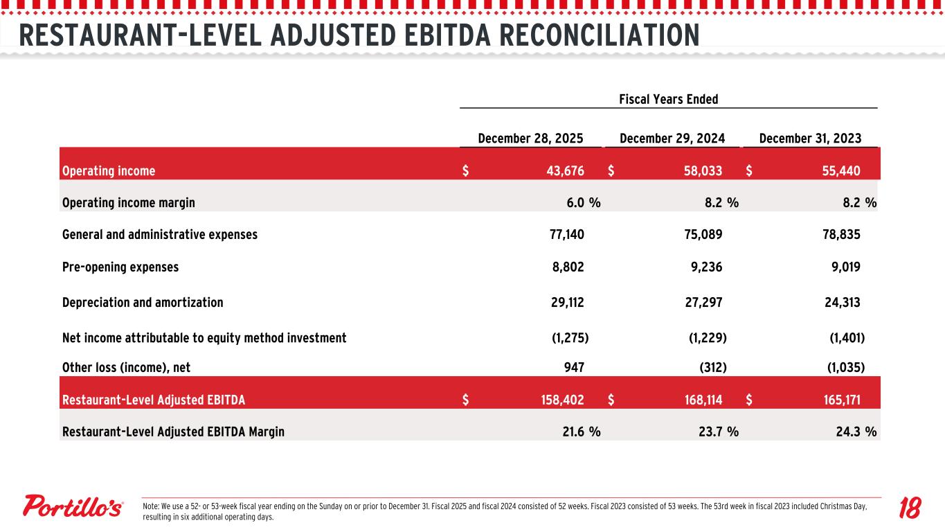 RESTAURANT-LEVEL ADJUSTED EBITDA RECONCILIATION Fiscal Years Ended December 28, 2025 December 29, 2024 December 31, 2023 Operating income $ 43,676 $ 58,033 $ 55,440 Operating income margin 6.0 % 8.2 % 8.2 % General and administrative expenses 77,140 75,089 78,835 Pre-opening expenses 8,802 9,236 9,019 Depreciation and amortization 29,112 27,297 24,313 Net income attributable to equity method investment (1,275) (1,229) (1,401) Other loss (income), net 947 (312) (1,035) Restaurant-Level Adjusted EBITDA $ 158,402 $ 168,114 $ 165,171 Restaurant-Level Adjusted EBITDA Margin 21.6 % 23.7 % 24.3 % Note: We use a 52- or 53-week fiscal year ending on the Sunday on or prior to December 31. Fiscal 2025 and fiscal 2024 consisted of 52 weeks. Fiscal 2023 consisted of 53 weeks. The 53rd week in fiscal 2023 included Christmas Day, resulting in six additional operating days.