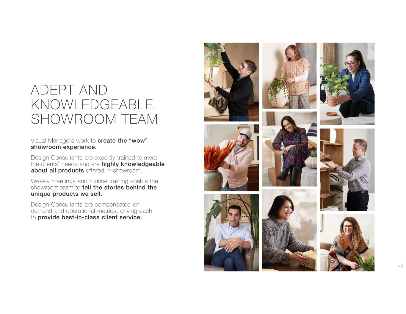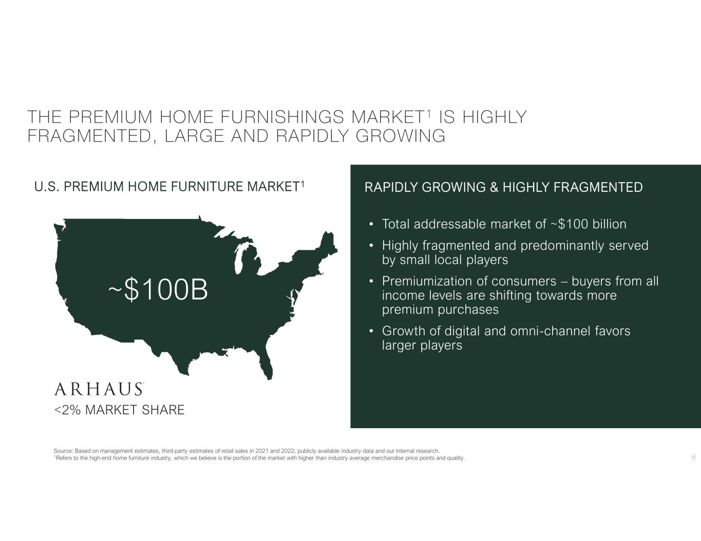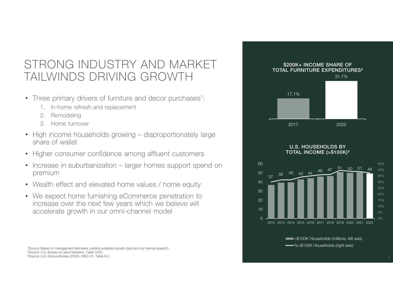 • Total addressable market of ~$100 billion • Highly fragmented and predominantly served by small local players • Premiumization of consumers – buyers from all income levels are shifting towards more premium purchases • Growth of digital and omni-channel favors larger players Source: Based on management estimates, third-party estimates of retail sales in 2021 and 2022, publicly available industry data and our internal research. 1Refers to the high-end home furniture industry, which we believe is the portion of the market with higher than industry average merchandise price points and quality. RAPIDLY GROWING & HIGHLY FRAGMENTEDU.S. PREMIUM HOME FURNITURE MARKET1 ~$100B <2% MARKET SHARE