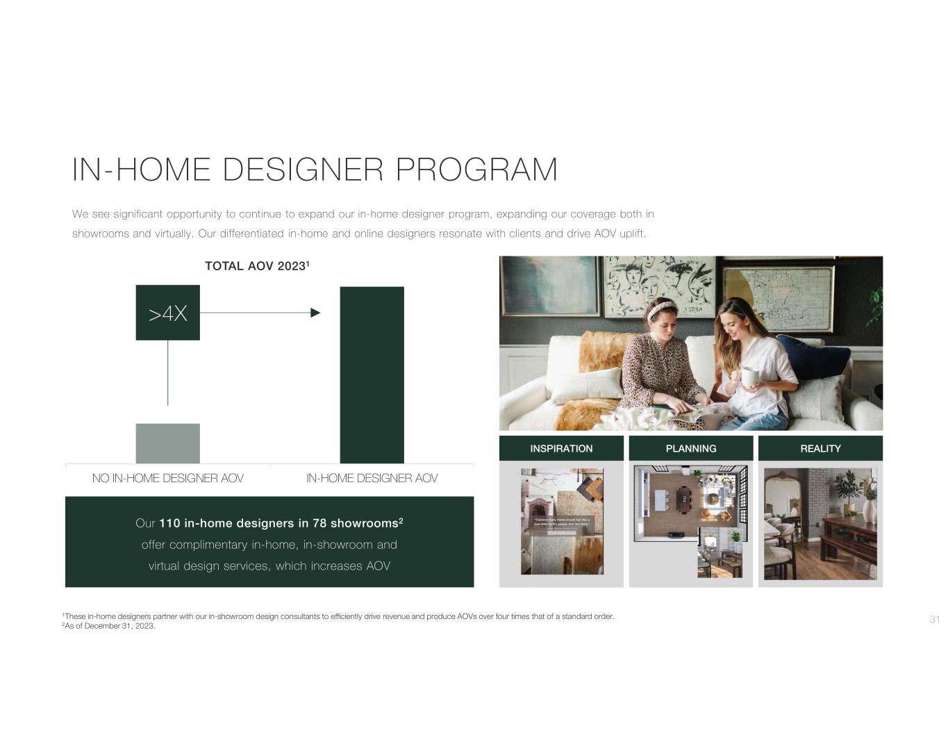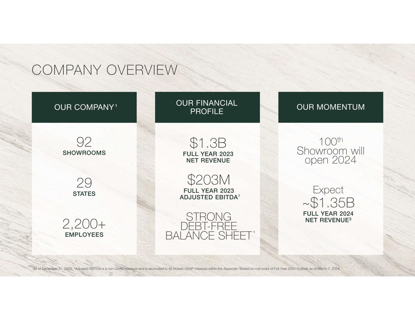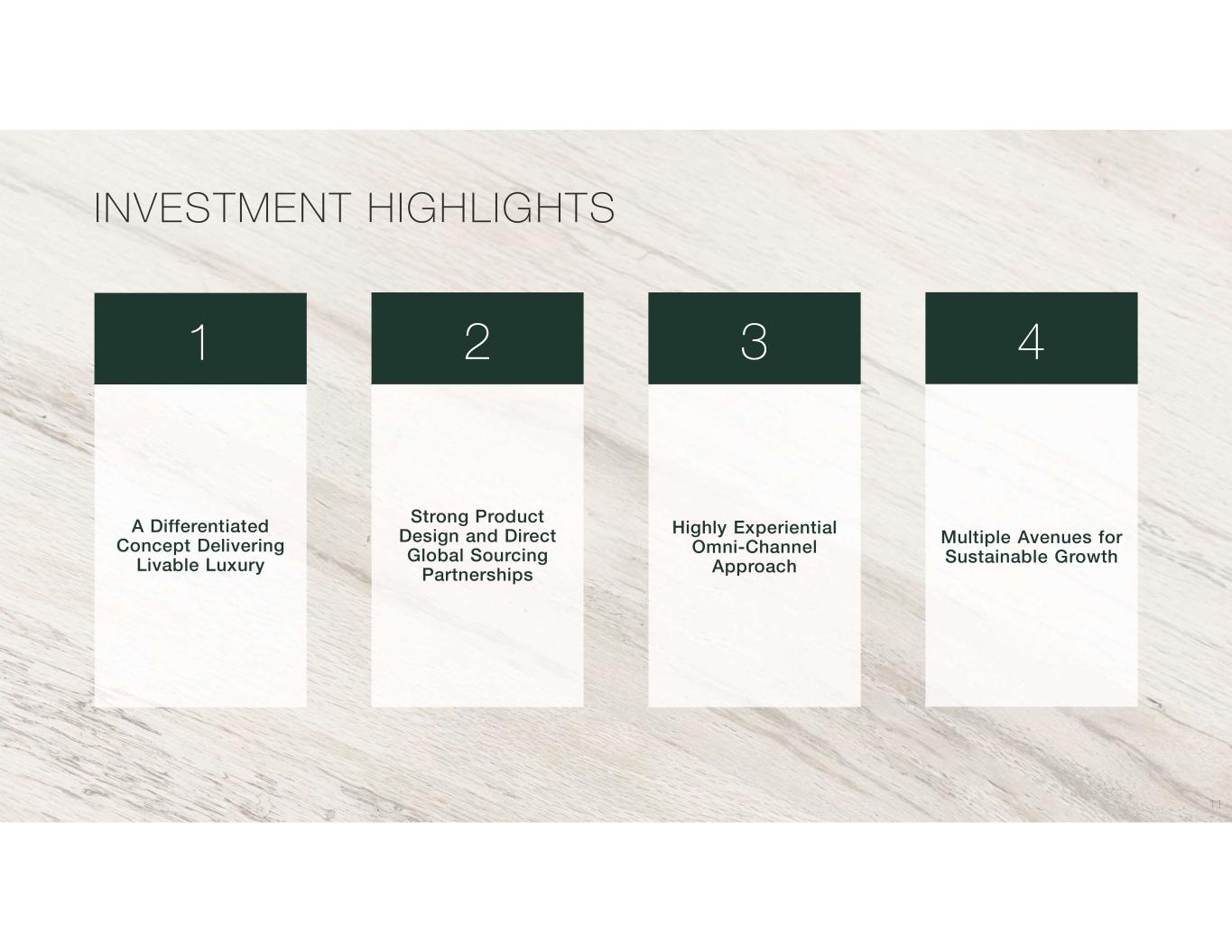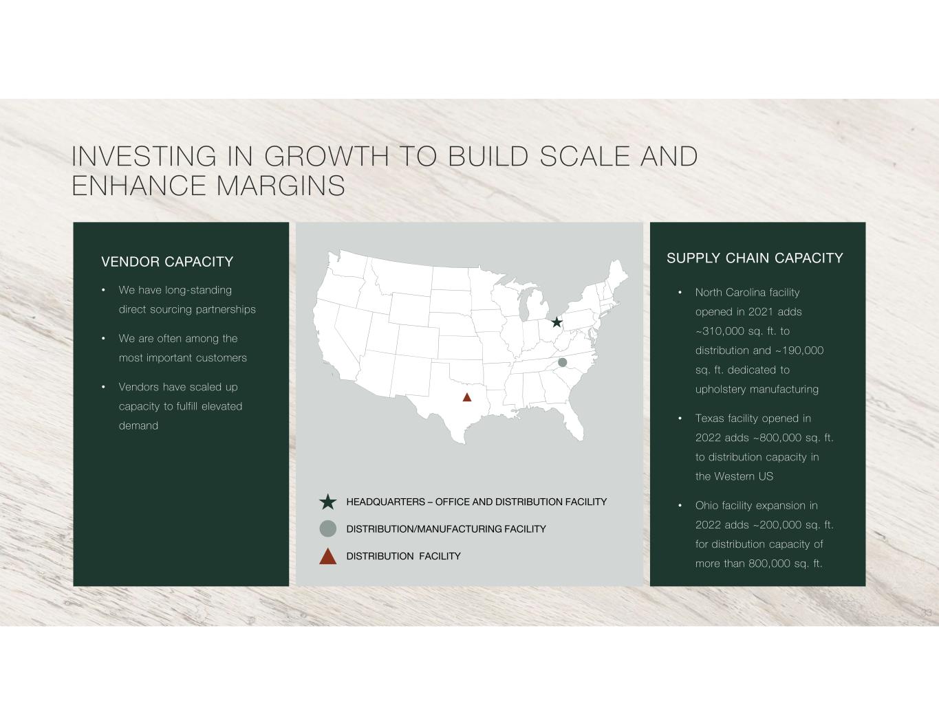 • Total addressable market of ~$100 billion • Highly fragmented and predominantly served by small local players • Premiumization of consumers – buyers from all income levels are shifting towards more premium purchases • Growth of digital and omni-channel favors larger players Source: Based on management estimates, third-party estimates of retail sales in 2021 and 2022, publicly available industry data and our internal research. 1Refers to the high-end home furniture industry, which we believe is the portion of the market with higher than industry average merchandise price points and quality. RAPIDLY GROWING & HIGHLY FRAGMENTEDU.S. PREMIUM HOME FURNITURE MARKET1 ~$100B <2% MARKET SHARE