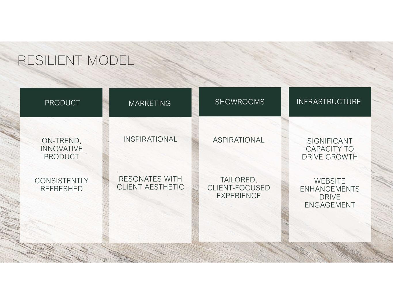 PRODUCT ON-TREND, INNOVATIVE PRODUCT CONSISTENTLY REFRESHED SHOWROOMS INFRASTRUCTUREMARKETING INSPIRATIONAL RESONATES WITH CLIENT AESTHETIC ASPIRATIONAL TAILORED, CLIENT-FOCUSED EXPERIENCE SIGNIFICANT CAPACITY TO DRIVE GROWTH WEBSITE ENHANCEMENTS DRIVE ENGAGEMENT