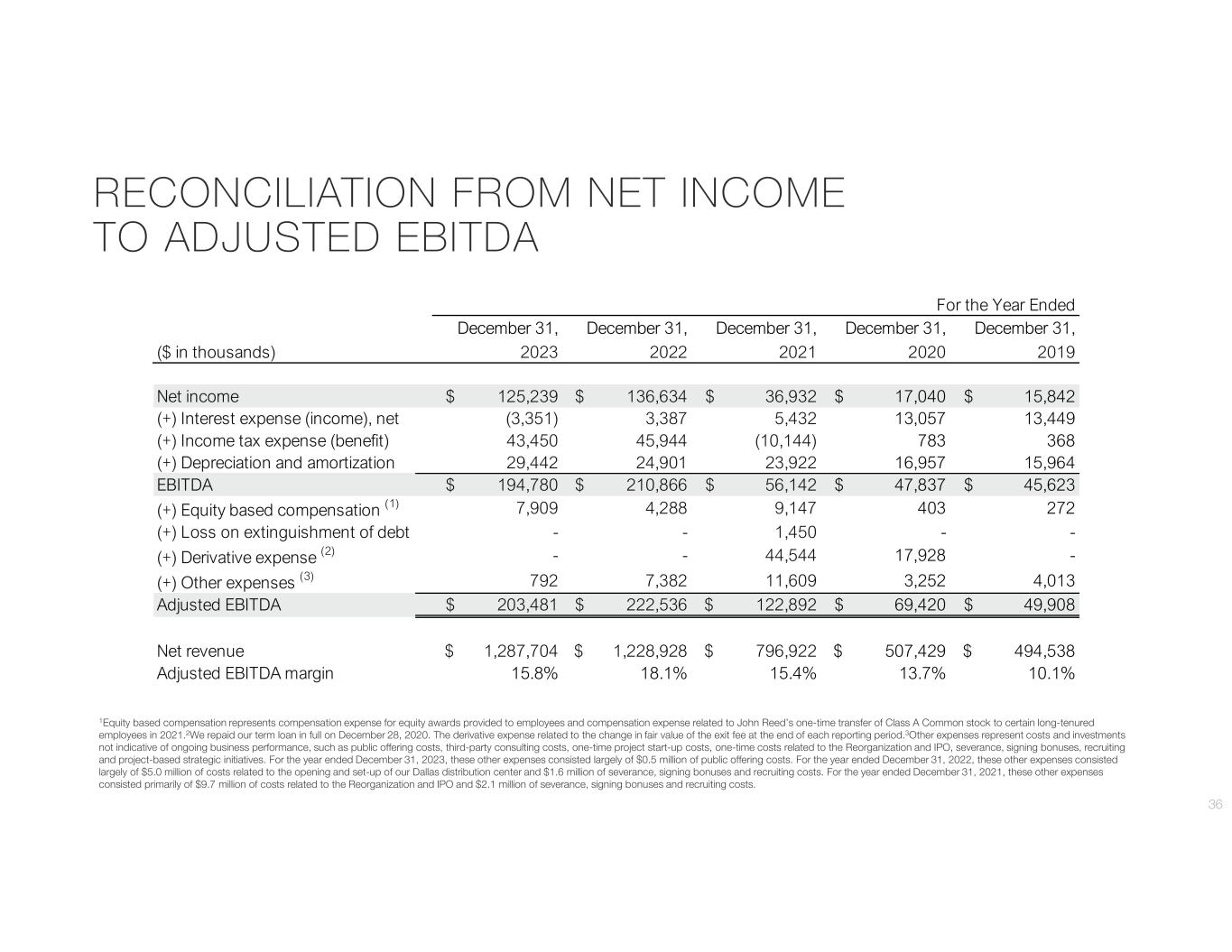 December 31, December 31, December 31, December 31, December 31, ($ in thousands) 2023 2022 2021 2020 2019 Net income $ 125,239 $ 136,634 $ 36,932 $ 17,040 $ 15,842 (+) Interest expense (income), net (3,351) 3,387 5,432 13,057 13,449 (+) Income tax expense (benefit) 43,450 45,944 (10,144) 783 368 (+) Depreciation and amortization 29,442 24,901 23,922 16,957 15,964 EBITDA $ 194,780 $ 210,866 $ 56,142 $ 47,837 $ 45,623 (+) Equity based compensation (1) 7,909 4,288 9,147 403 272 (+) Loss on extinguishment of debt - - 1,450 - - (+) Derivative expense (2) - - 44,544 17,928 - (+) Other expenses (3) 792 7,382 11,609 3,252 4,013 Adjusted EBITDA $ 203,481 $ 222,536 $ 122,892 $ 69,420 $ 49,908 Net revenue $ 1,287,704 $ 1,228,928 $ 796,922 $ 507,429 $ 494,538 Adjusted EBITDA margin 15.8% 18.1% 15.4% 13.7% 10.1% For the Year Ended