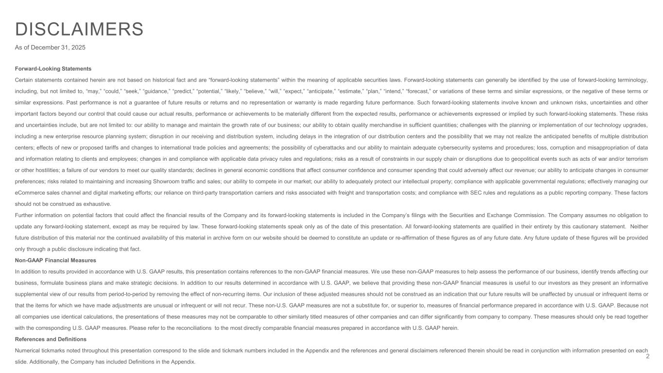 2 DISCLAIMERS As of December 31, 2025 Forward-Looking Statements Certain statements contained herein are not based on historical fact and are “forward-looking statements” within the meaning of applicable securities laws. Forward-looking statements can generally be identified by the use of forward-looking terminology, including, but not limited to, “may,” “could,” “seek,” “guidance,” “predict,” “potential,” “likely,” “believe,” “will,” “expect,” “anticipate,” “estimate,” “plan,” “intend,” “forecast,” or variations of these terms and similar expressions, or the negative of these terms or similar expressions. Past performance is not a guarantee of future results or returns and no representation or warranty is made regarding future performance. Such forward-looking statements involve known and unknown risks, uncertainties and other important factors beyond our control that could cause our actual results, performance or achievements to be materially different from the expected results, performance or achievements expressed or implied by such forward-looking statements. These risks and uncertainties include, but are not limited to: our ability to manage and maintain the growth rate of our business; our ability to obtain quality merchandise in sufficient quantities; challenges with the planning or implementation of our technology upgrades, including a new enterprise resource planning system; disruption in our receiving and distribution system, including delays in the integration of our distribution centers and the possibility that we may not realize the anticipated benefits of multiple distribution centers; effects of new or proposed tariffs and changes to international trade policies and agreements; the possibility of cyberattacks and our ability to maintain adequate cybersecurity systems and procedures; loss, corruption and misappropriation of data and information relating to clients and employees; changes in and compliance with applicable data privacy rules and regulations; risks as a result of constraints in our supply chain or disruptions due to geopolitical events such as acts of war and/or terrorism or other hostilities; a failure of our vendors to meet our quality standards; declines in general economic conditions that affect consumer confidence and consumer spending that could adversely affect our revenue; our ability to anticipate changes in consumer preferences; risks related to maintaining and increasing Showroom traffic and sales; our ability to compete in our market; our ability to adequately protect our intellectual property; compliance with applicable governmental regulations; effectively managing our eCommerce sales channel and digital marketing efforts; our reliance on third-party transportation carriers and risks associated with freight and transportation costs; and compliance with SEC rules and regulations as a public reporting company. These factors should not be construed as exhaustive. Further information on potential factors that could affect the financial results of the Company and its forward-looking statements is included in the Company’s filings with the Securities and Exchange Commission. The Company assumes no obligation to update any forward-looking statement, except as may be required by law. These forward-looking statements speak only as of the date of this presentation. All forward-looking statements are qualified in their entirety by this cautionary statement. Neither future distribution of this material nor the continued availability of this material in archive form on our website should be deemed to constitute an update or re-affirmation of these figures as of any future date. Any future update of these figures will be provided only through a public disclosure indicating that fact. Non-GAAP Financial Measures In addition to results provided in accordance with U.S. GAAP results, this presentation contains references to the non-GAAP financial measures. We use these non-GAAP measures to help assess the performance of our business, identify trends affecting our business, formulate business plans and make strategic decisions. In addition to our results determined in accordance with U.S. GAAP, we believe that providing these non-GAAP financial measures is useful to our investors as they present an informative supplemental view of our results from period-to-period by removing the effect of non-recurring items. Our inclusion of these adjusted measures should not be construed as an indication that our future results will be unaffected by unusual or infrequent items or that the items for which we have made adjustments are unusual or infrequent or will not recur. These non-U.S. GAAP measures are not a substitute for, or superior to, measures of financial performance prepared in accordance with U.S. GAAP. Because not all companies use identical calculations, the presentations of these measures may not be comparable to other similarly titled measures of other companies and can differ significantly from company to company. These measures should only be read together with the corresponding U.S. GAAP measures. Please refer to the reconciliations to the most directly comparable financial measures prepared in accordance with U.S. GAAP herein. References and Definitions Numerical tickmarks noted throughout this presentation correspond to the slide and tickmark numbers included in the Appendix and the references and general disclaimers referenced therein should be read in conjunction with information presented on each slide. Additionally, the Company has included Definitions in the Appendix.