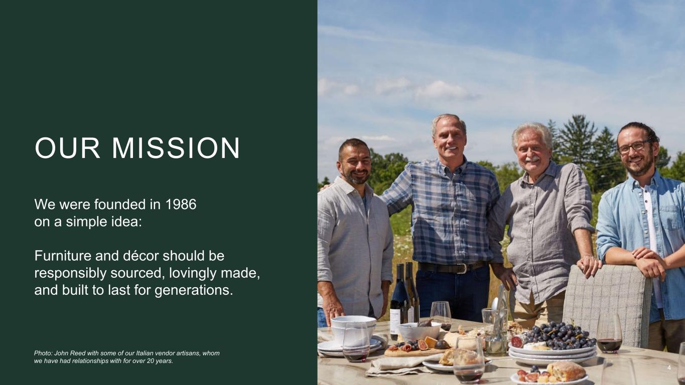 Photo: John Reed with some of our Italian vendor artisans, whom we have had relationships with for over 20 years. 4 OUR MISSION We were founded in 1986 on a simple idea: Furniture and décor should be responsibly sourced, lovingly made, and built to last for generations. 4