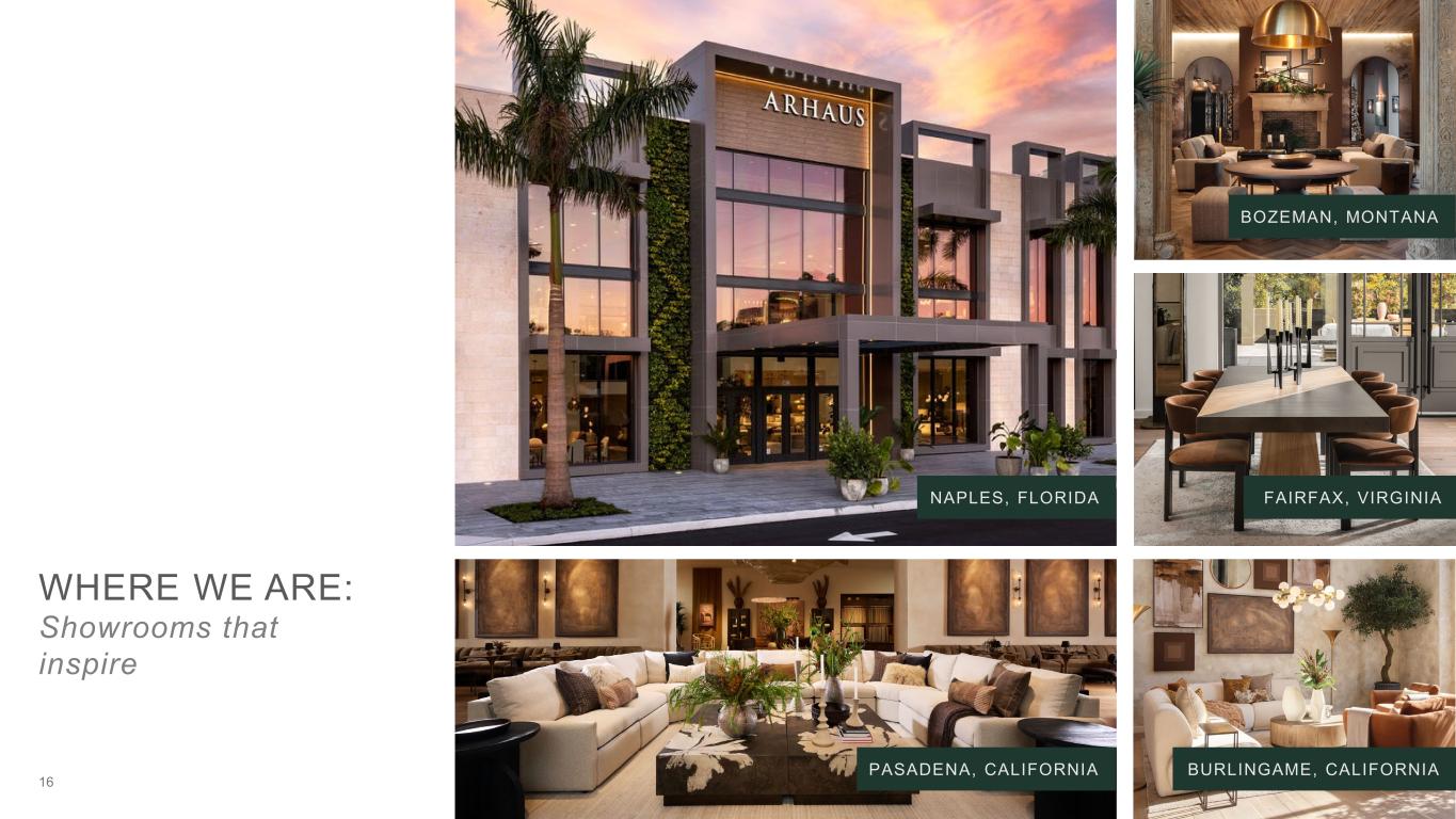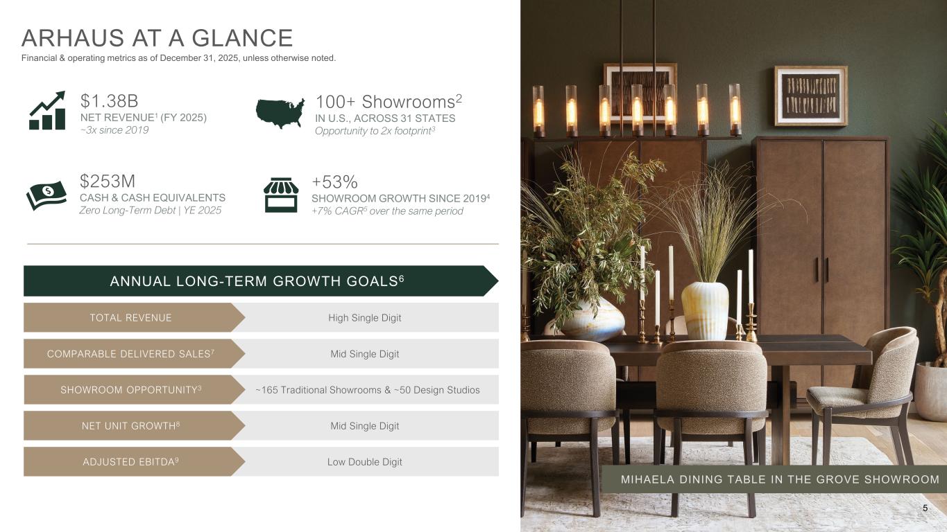 ARHAUS AT A GLANCE Financial & operating metrics as of December 31, 2025, unless otherwise noted. $1.38B NET REVENUE1 (FY 2025) ~3x since 2019 $253M CASH & CASH EQUIVALENTS Zero Long-Term Debt | YE 2025 High Single Digit ~165 Traditional Showrooms & ~50 Design Studios Mid Single Digit Low Double Digit TOTAL REVENUE SHOWROOM OPPORTUNITY3 COMPARABLE DELIVERED SALES7 ADJUSTED EBITDA9 Mid Single DigitNET UNIT GROWTH8 ANNUAL LONG-TERM GROWTH GOALS6 +53% SHOWROOM GROWTH SINCE 20194 +7% CAGR5 over the same period MIHAELA DINING TABLE IN THE GROVE SHOWROOM 100+ Showrooms2 IN U.S., ACROSS 31 STATES Opportunity to 2x footprint3 5