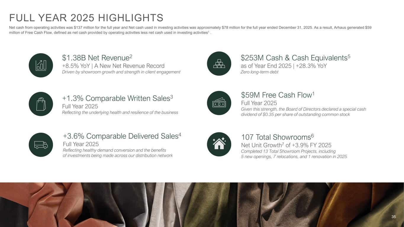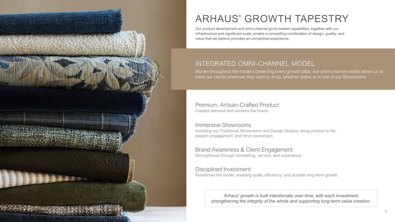 6 Adjusted EBITDA3: $145M | ~3x since 2019 Strong operating leverage and disciplined cost management, tripling Adjusted EBITDA since 2019, representing a +190% increase. Net Revenue1: $1.38B | ~3x since 2019 Exceptional top-line growth, nearly tripling net revenue since 2019, representing a +179% increase. Showrooms4: 100+ | +53% since 2019 +53% showroom growth and a 7% CAGR since 20195; opportunity to double6 the current footprint over time. EXECUTING WITH DISCIPLINE Strong balance sheet and liquidity Zero long-term debt with significant cash, providing flexibility to invest through cycles. Disciplined capital allocation Funding showroom growth, technology, and infrastructure while maintaining financial strength. Thoughtful pace of showroom expansion Showroom growth paced by economics and market readiness. Integrated omni-channel model Connects touchpoints across the client journey to deliver a premium, high-touch experience. Working capital and inventory discipline Inventory levels aligned with demand and delivery performance, supporting cash flow. Balanced approach to shareholder returns Capital deployment evaluated holistically to support long-term value creation; Arhaus has issued a special cash dividend twice since initial public offering. A PROVEN MODEL, EXECUTED WITH DISCIPLINE Long-term value creation driven by scale, profitability, and capital discipline. PROOF OUR MODEL IS WORKING Financial & operating metrics as of December 31, 2025, unless otherwise noted. Net Income2: $67M | ~4x since 2019 Bottom line has scaled meaningfully, more than quadrupling net income since 2019, representing a 325% increase.