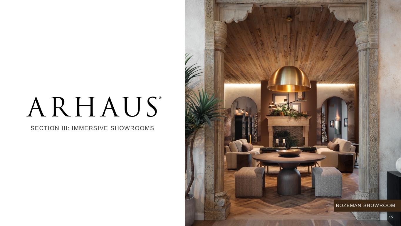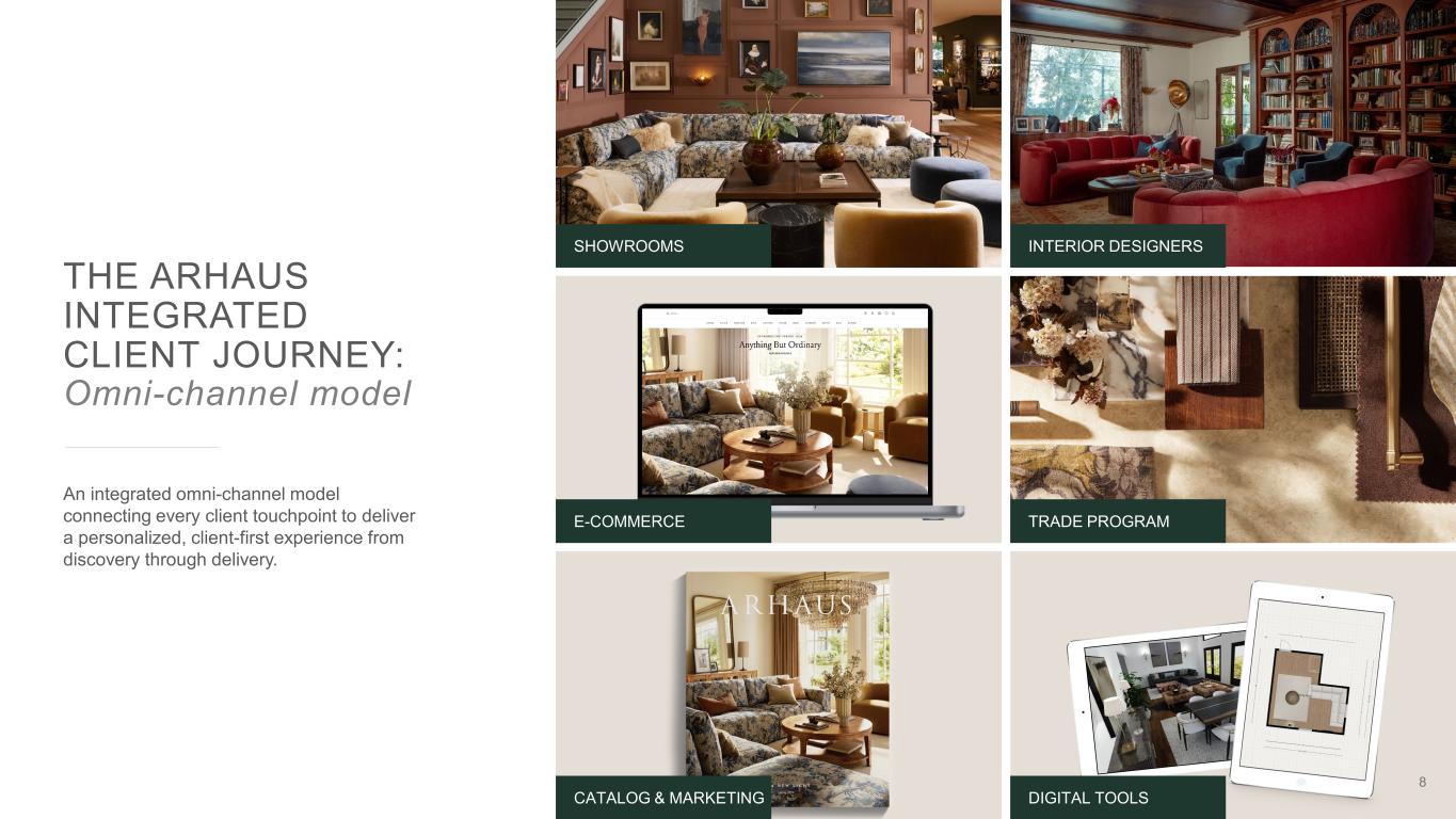 THE ARHAUS INTEGRATED CLIENT JOURNEY: Omni-channel model An integrated omni-channel model connecting every client touchpoint to deliver a personalized, client-first experience from discovery through delivery. INTERIOR DESIGNERS 8 SHOWROOMS E-COMMERCE TRADE PROGRAM CATALOG & MARKETING DIGITAL TOOLS