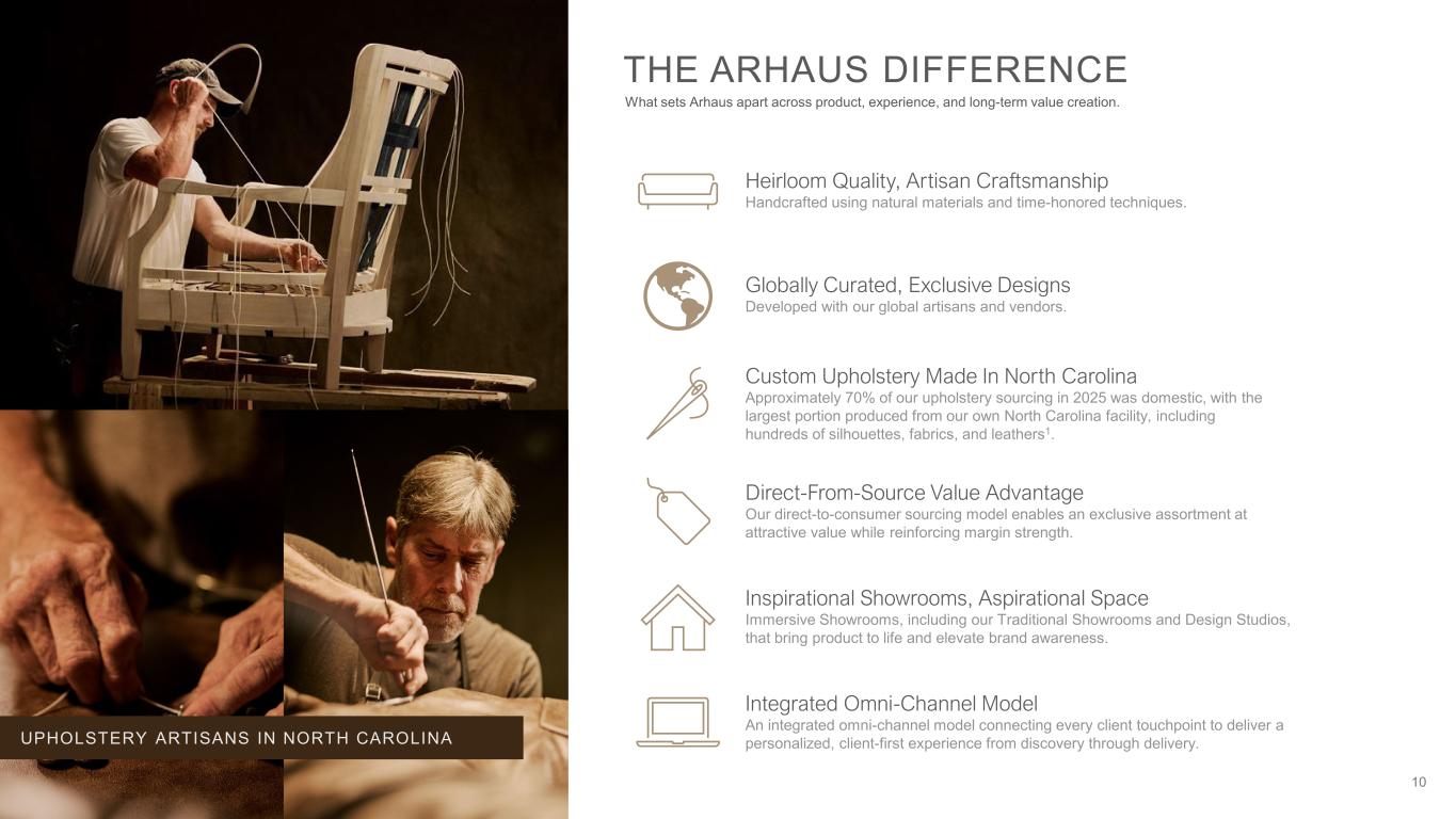 10 Heirloom Quality, Artisan Craftsmanship Handcrafted using natural materials and time-honored techniques. Custom Upholstery Made In North Carolina Approximately 70% of our upholstery sourcing in 2025 was domestic, with the largest portion produced from our own North Carolina facility, including hundreds of silhouettes, fabrics, and leathers1. Globally Curated, Exclusive Designs Developed with our global artisans and vendors. Inspirational Showrooms, Aspirational Space Immersive Showrooms, including our Traditional Showrooms and Design Studios, that bring product to life and elevate brand awareness. Integrated Omni-Channel Model An integrated omni-channel model connecting every client touchpoint to deliver a personalized, client-first experience from discovery through delivery. Direct-From-Source Value Advantage Our direct-to-consumer sourcing model enables an exclusive assortment at attractive value while reinforcing margin strength. THE ARHAUS DIFFERENCE What sets Arhaus apart across product, experience, and long-term value creation. UPHOLSTERY ARTISANS IN NORTH CAROLINA