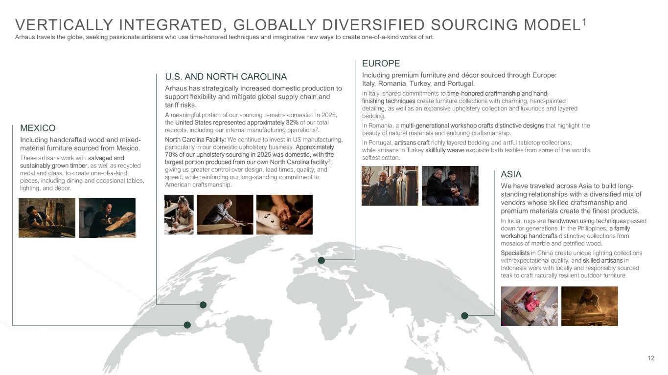 12 VERTICALLY INTEGRATED, GLOBALLY DIVERSIFIED SOURCING MODEL1 Arhaus travels the globe, seeking passionate artisans who use time-honored techniques and imaginative new ways to create one-of-a-kind works of art. MEXICO Including handcrafted wood and mixed- material furniture sourced from Mexico. These artisans work with salvaged and sustainably grown timber, as well as recycled metal and glass, to create one-of-a-kind pieces, including dining and occasional tables, lighting, and décor. U.S. AND NORTH CAROLINA Arhaus has strategically increased domestic production to support flexibility and mitigate global supply chain and tariff risks. A meaningful portion of our sourcing remains domestic. In 2025, the United States represented approximately 32% of our total receipts, including our internal manufacturing operations2. North Carolina Facility: We continue to invest in US manufacturing, particularly in our domestic upholstery business. Approximately 70% of our upholstery sourcing in 2025 was domestic, with the largest portion produced from our own North Carolina facility2, giving us greater control over design, lead times, quality, and speed, while reinforcing our long-standing commitment to American craftsmanship. ASIA We have traveled across Asia to build long- standing relationships with a diversified mix of vendors whose skilled craftsmanship and premium materials create the finest products. In India, rugs are handwoven using techniques passed down for generations. In the Philippines, a family workshop handcrafts distinctive collections from mosaics of marble and petrified wood. Specialists in China create unique lighting collections with expectational quality, and skilled artisans in Indonesia work with locally and responsibly sourced teak to craft naturally resilient outdoor furniture. EUROPE Including premium furniture and décor sourced through Europe: Italy, Romania, Turkey, and Portugal. In Italy, shared commitments to time-honored craftmanship and hand- finishing techniques create furniture collections with charming, hand-painted detailing, as well as an expansive upholstery collection and luxurious and layered bedding. In Romania, a multi-generational workshop crafts distinctive designs that highlight the beauty of natural materials and enduring craftsmanship. In Portugal, artisans craft richly layered bedding and artful tabletop collections, while artisans in Turkey skillfully weave exquisite bath textiles from some of the world’s softest cotton.