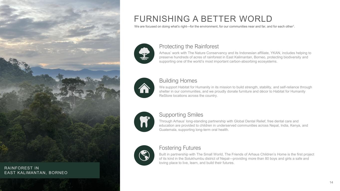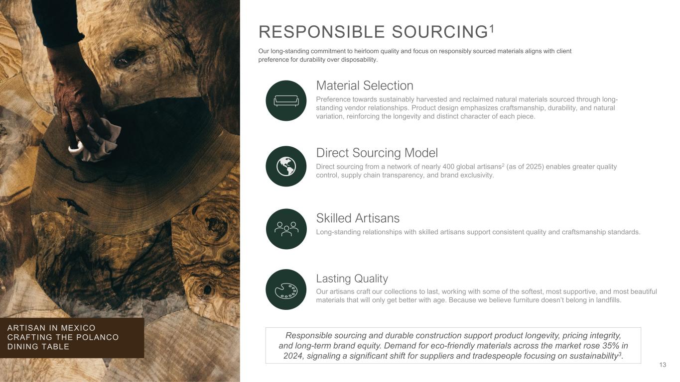 13 RESPONSIBLE SOURCING1 Our long-standing commitment to heirloom quality and focus on responsibly sourced materials aligns with client preference for durability over disposability. Material Selection Preference towards sustainably harvested and reclaimed natural materials sourced through long- standing vendor relationships. Product design emphasizes craftsmanship, durability, and natural variation, reinforcing the longevity and distinct character of each piece. Direct Sourcing Model Direct sourcing from a network of nearly 400 global artisans2 (as of 2025) enables greater quality control, supply chain transparency, and brand exclusivity. Skilled Artisans Long-standing relationships with skilled artisans support consistent quality and craftsmanship standards. Responsible sourcing and durable construction support product longevity, pricing integrity, and long-term brand equity. Demand for eco-friendly materials across the market rose 35% in 2024, signaling a significant shift for suppliers and tradespeople focusing on sustainability3. ARTISAN IN MEXICO CRAFTING THE POLANCO DINING TABLE Lasting Quality Our artisans craft our collections to last, working with some of the softest, most supportive, and most beautiful materials that will only get better with age. Because we believe furniture doesn’t belong in landfills.