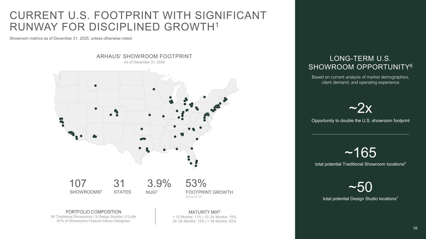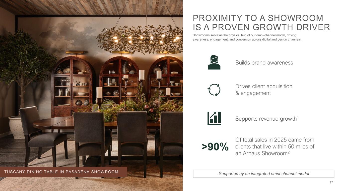 PROXIMITY TO A SHOWROOM IS A PROVEN GROWTH DRIVER Showrooms serve as the physical hub of our omni-channel model, driving awareness, engagement, and conversion across digital and design channels. Supports revenue growth1 Builds brand awareness Drives client acquisition & engagement Supported by an integrated omni-channel modelTUSCANY DINING TABLE IN PASADENA SHOWROOM >90% Of total sales in 2025 came from clients that live within 50 miles of an Arhaus Showroom2 17